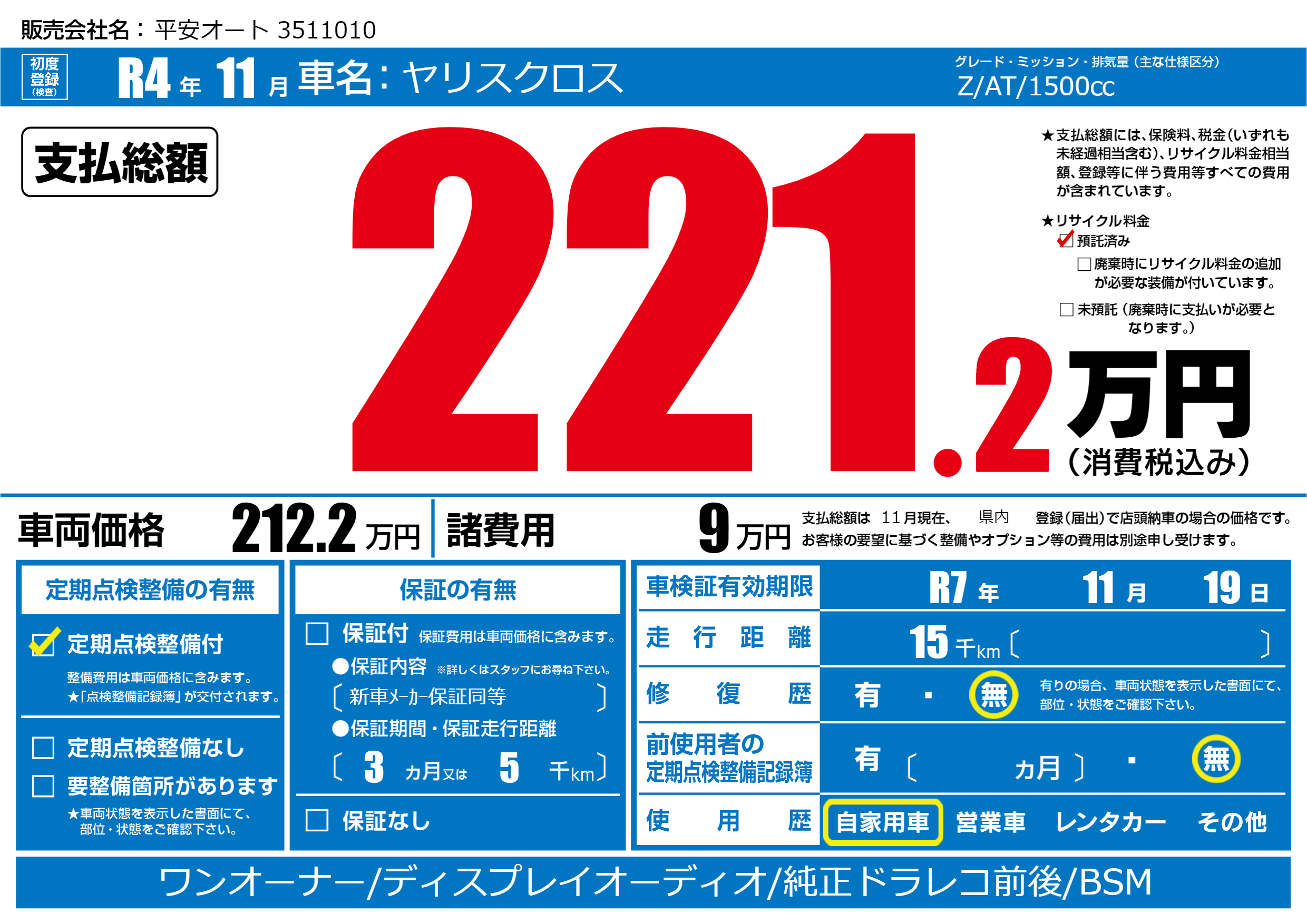 | リサイクル料金 預託済 |