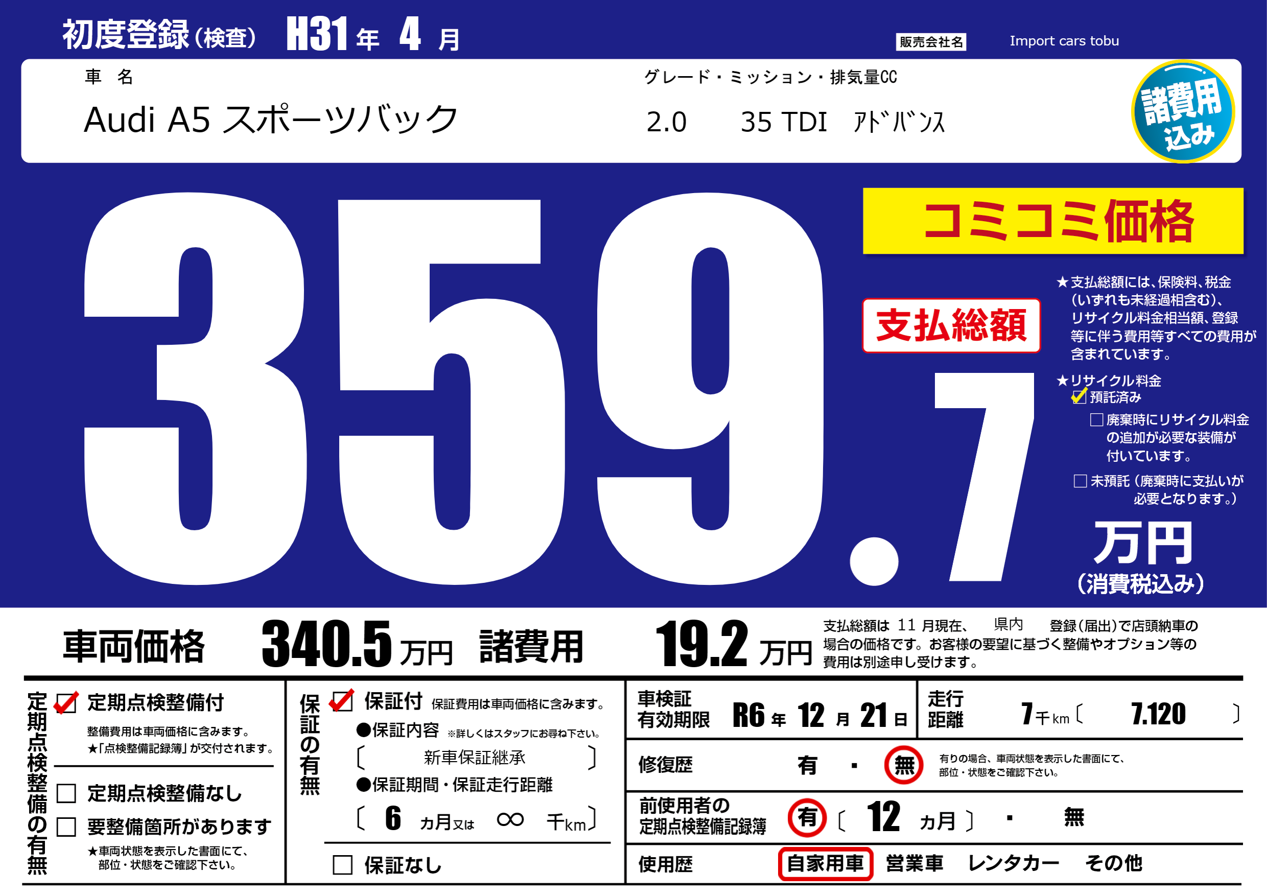 | 車検制限 | R6年 12月 21日 | ||