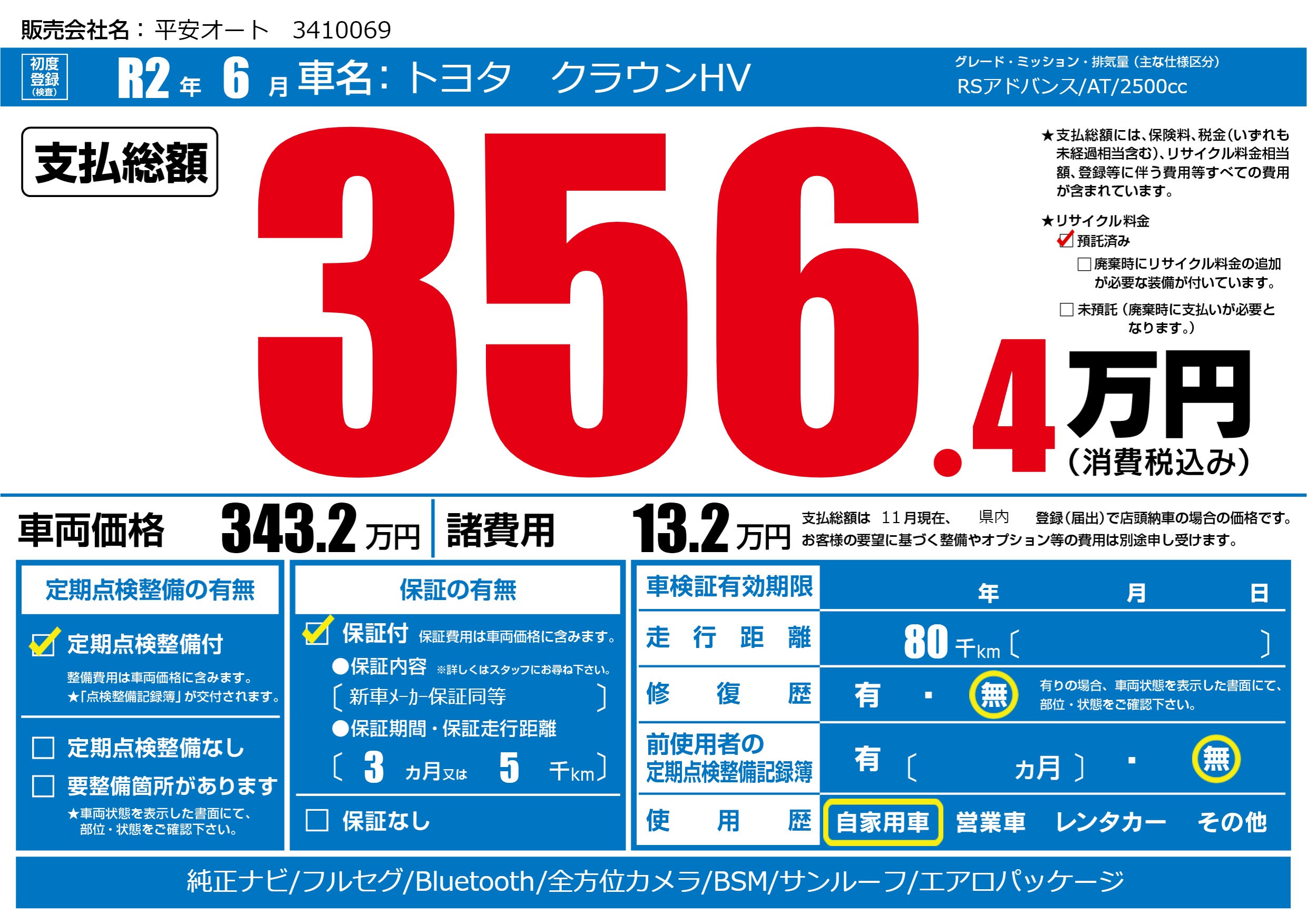 | 走行キロ | 8万km | 初年度登録 | R2年6月 |