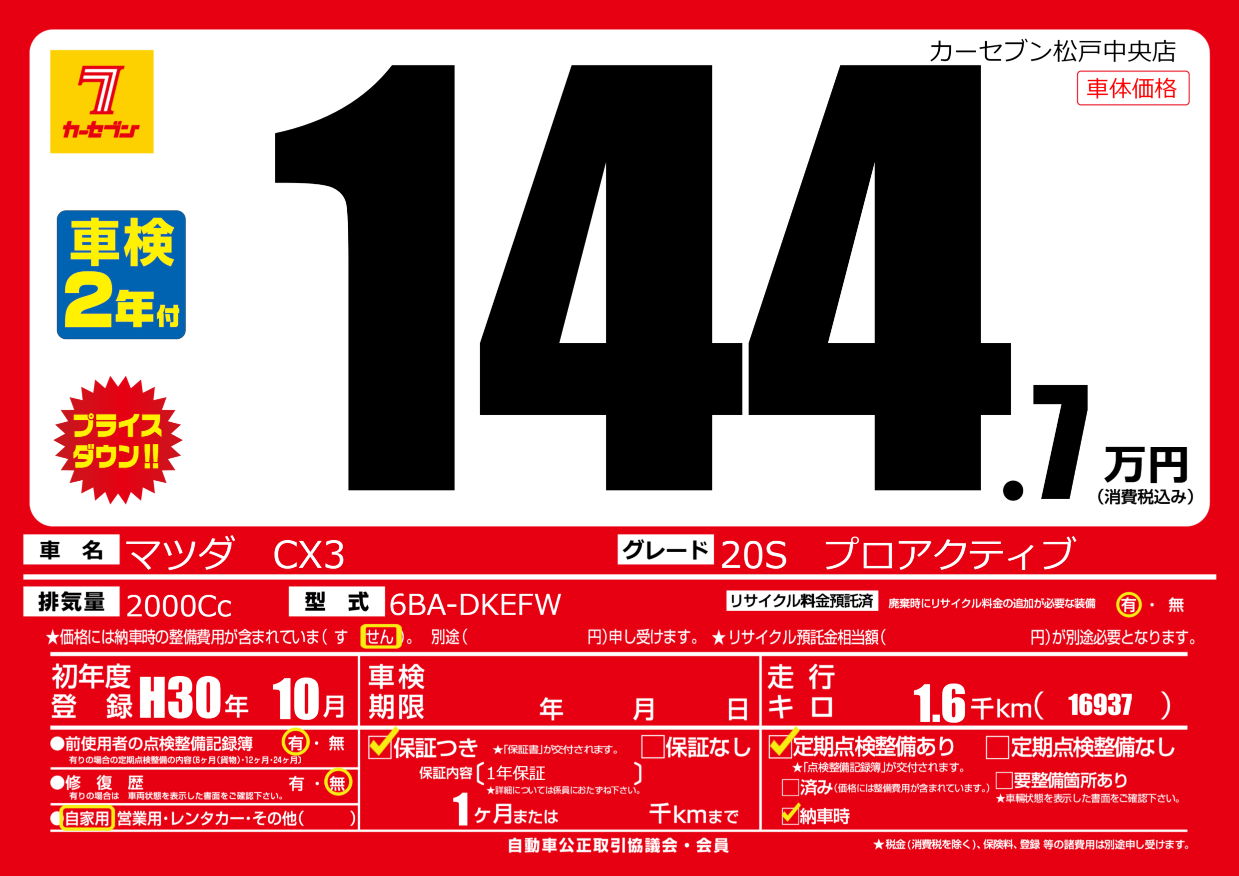 | 車名 | マツダ CX3 | グレード ミッション 排気量 |