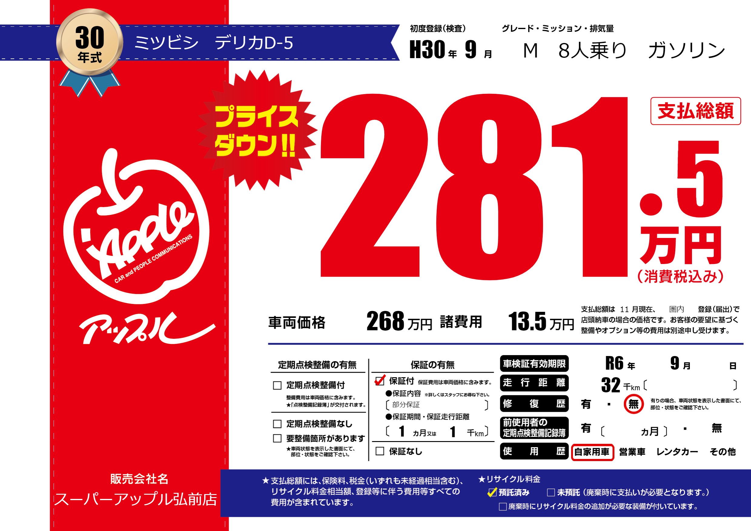 | 車検制限 | R6年 9月 - 日 | ||