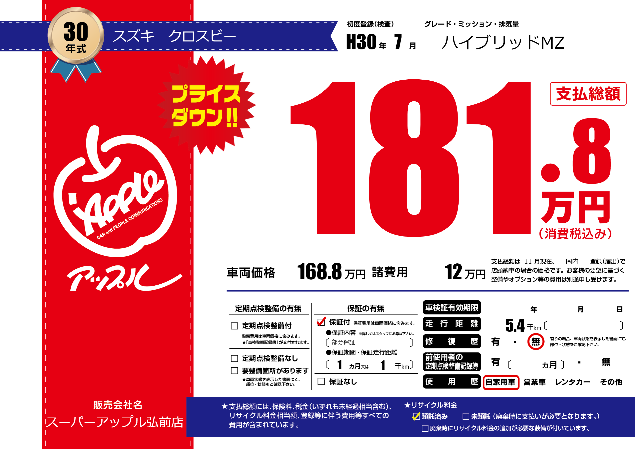 | 走行キロ | 0.5万km | 初年度登録 | H30年7月 |