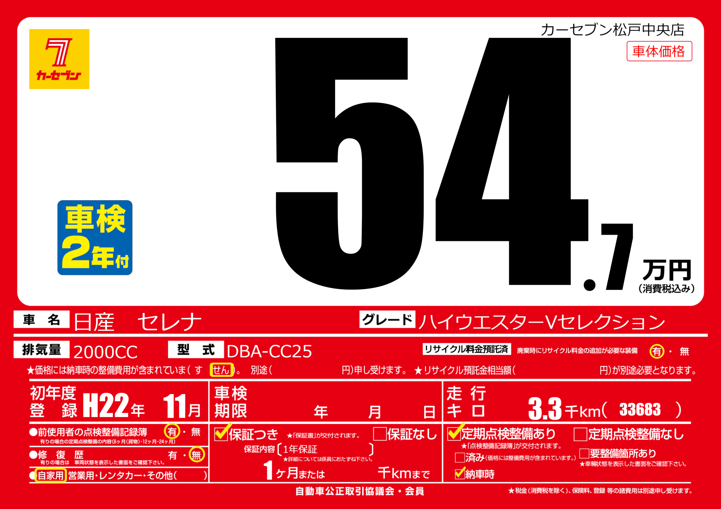 | 車名 | 日産 セレナ | グレード ミッション 排気量 |