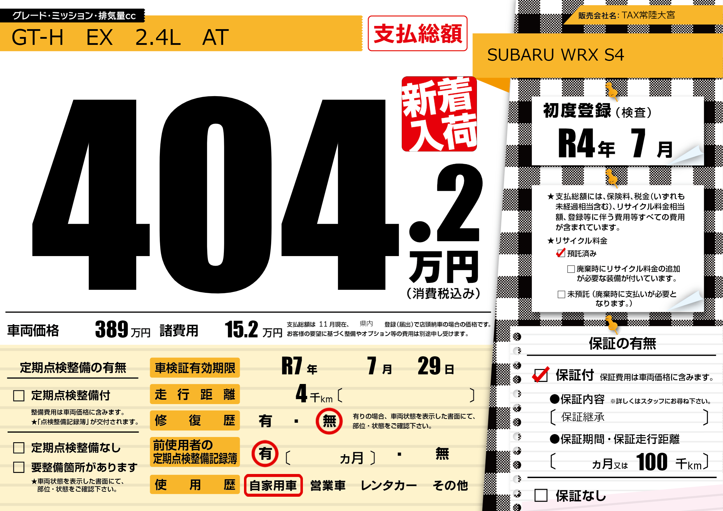 | 車名 | SUBARU WRX S4 | グレード ミッション 排気量 |