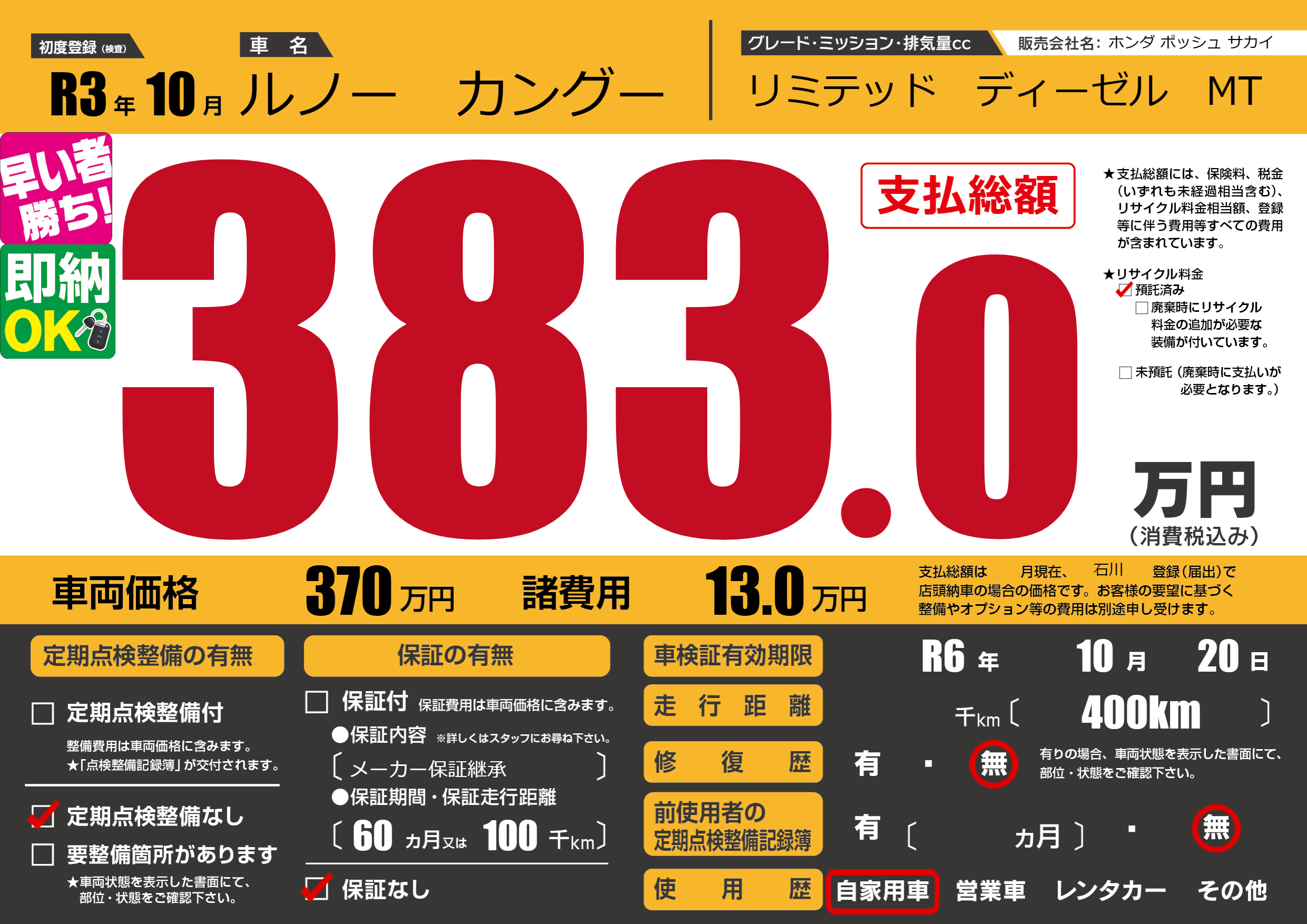 | 走行キロ | - | 初年度登録 | R3年10月 |