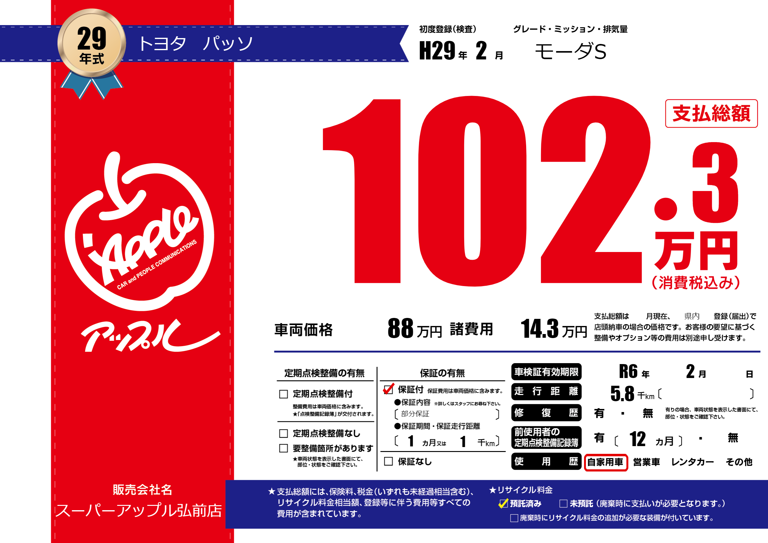 | 車名 | トヨタ パッソ | グレード ミッション 排気量 |