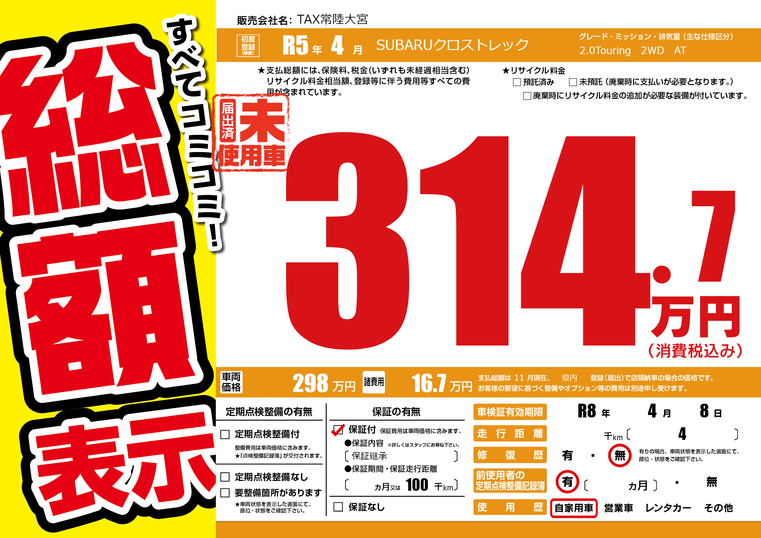 | 車名 | SUBARUクロストレック | グレード ミッション 排気量 |