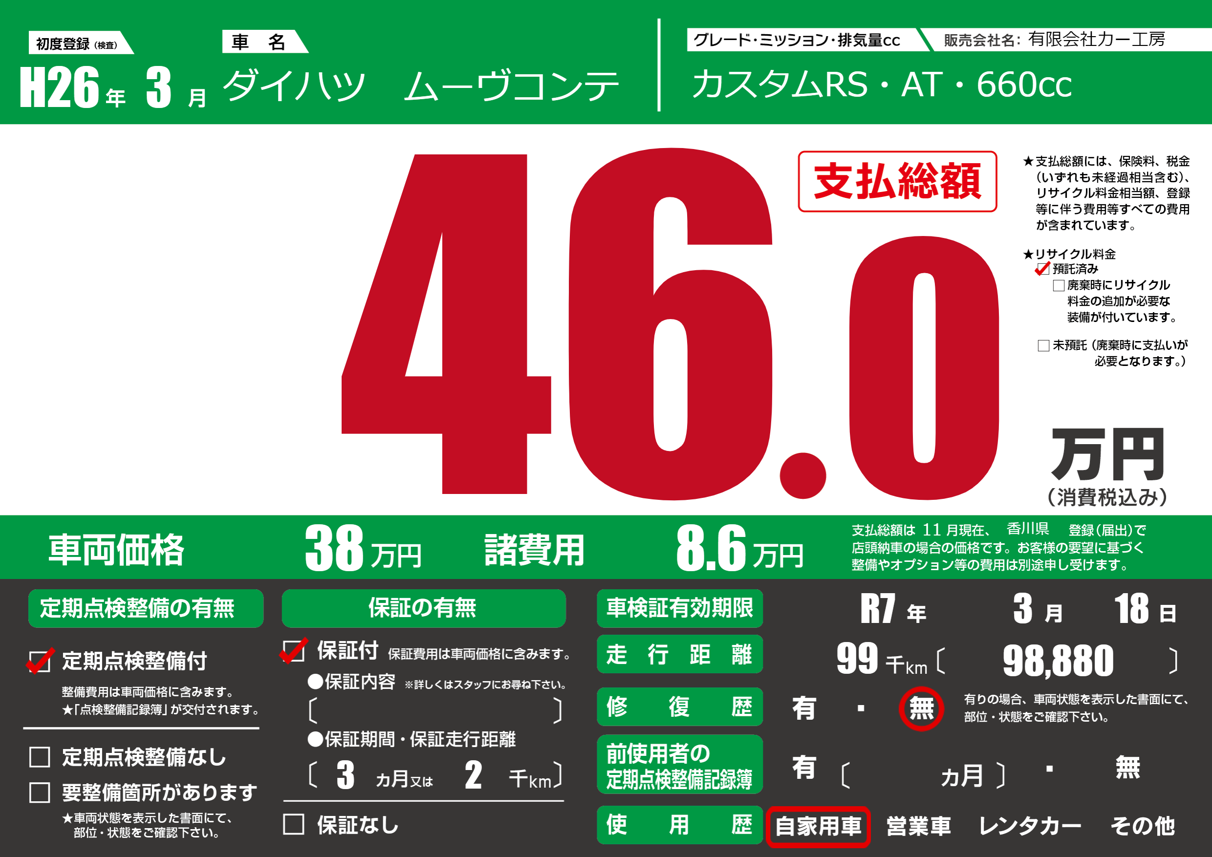 | 車名 | ダイハツ ムーヴコンテ | グレード ミッション 排気量 |