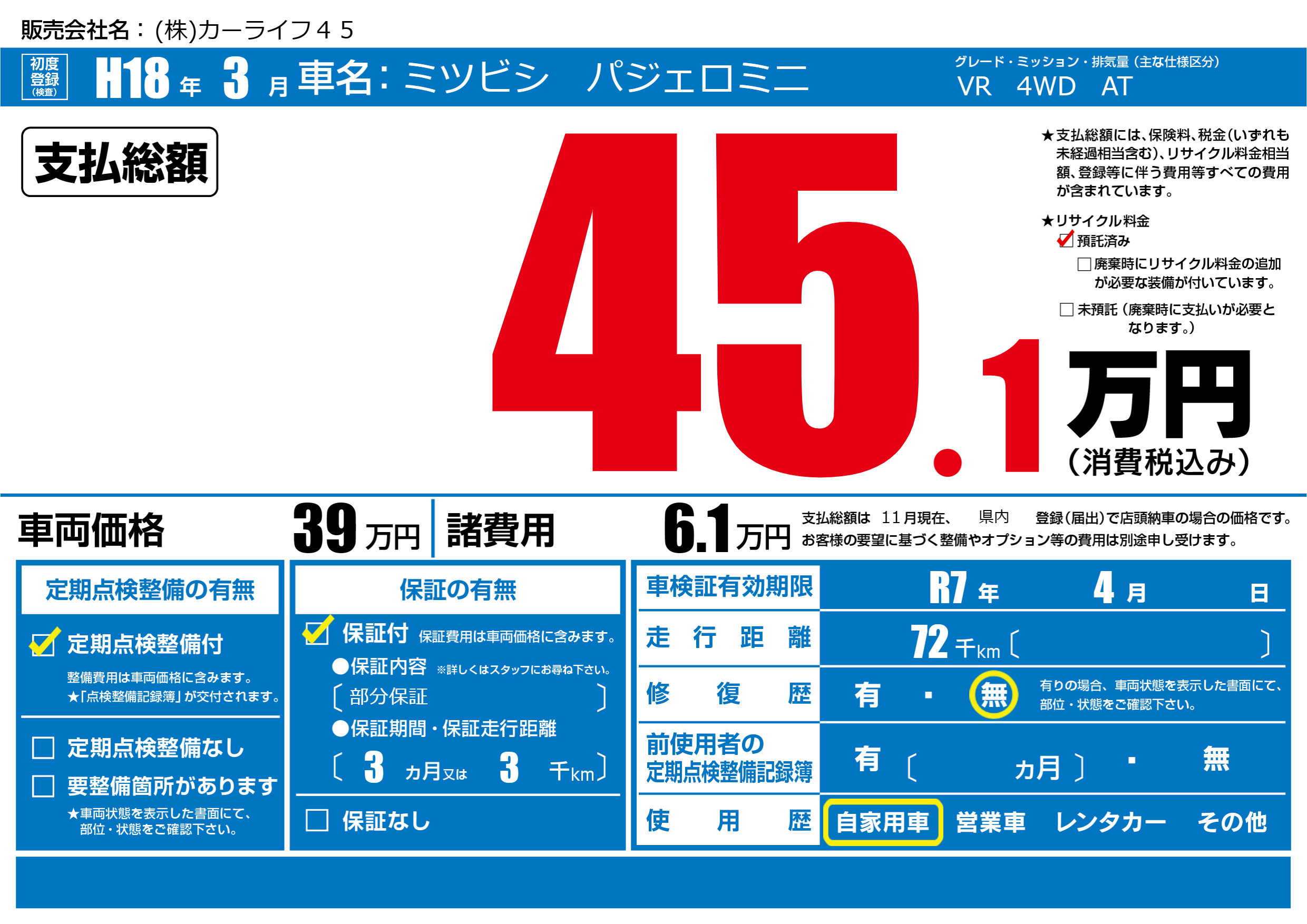 なし | 車検制限 | R7年4月---月 |