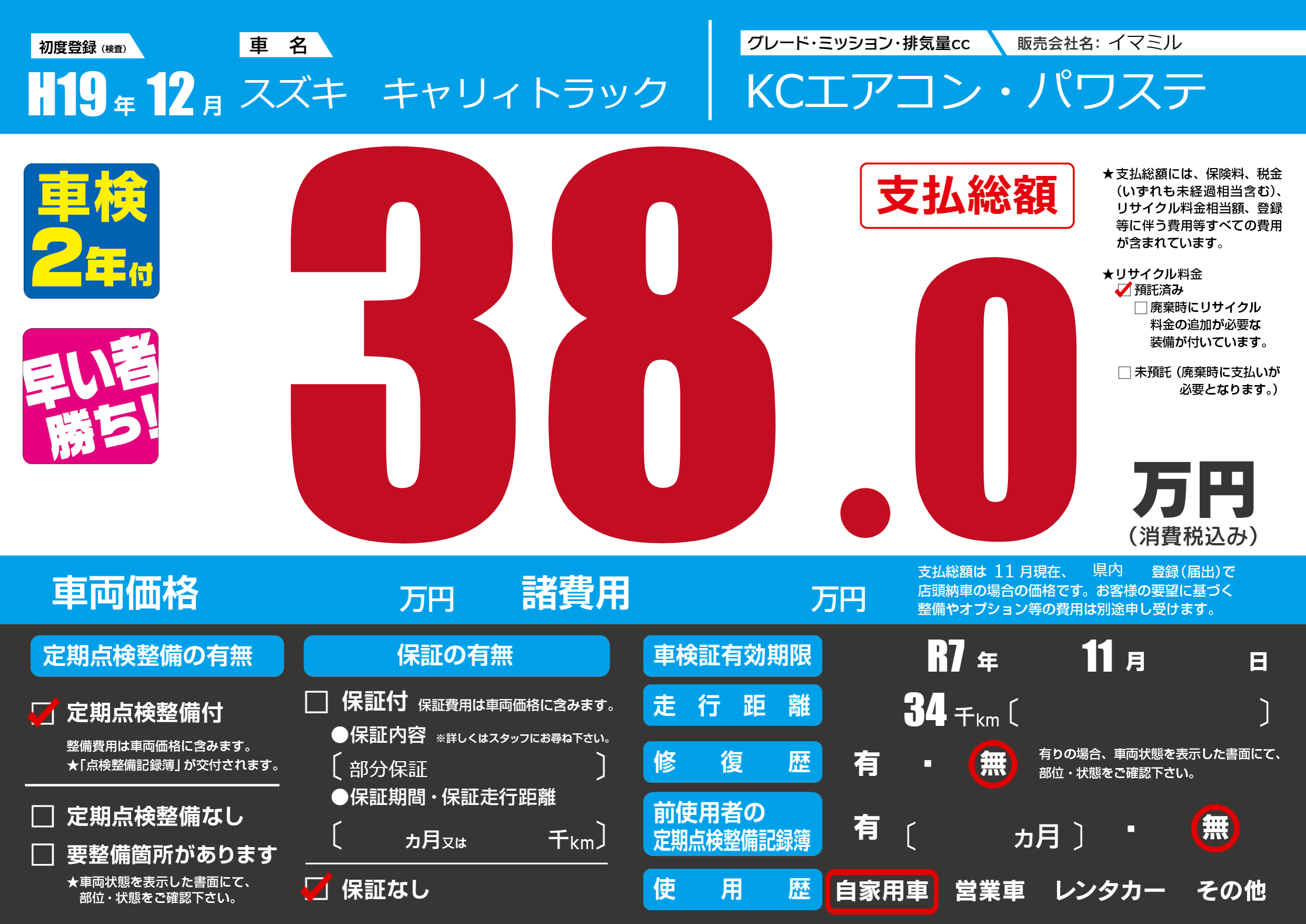 | 走行キロ | 3.4万km | 初年度登録 | H19年12月 |
