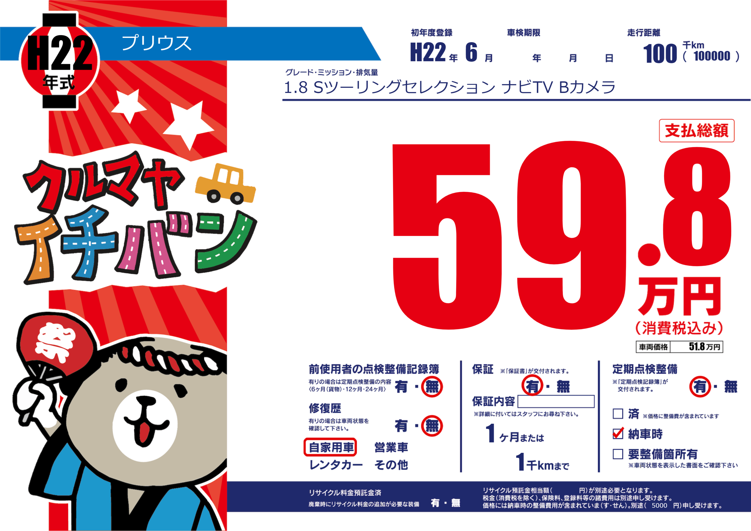 | 走行キロ | 10万km | 初年度登録 | H22年6月 |