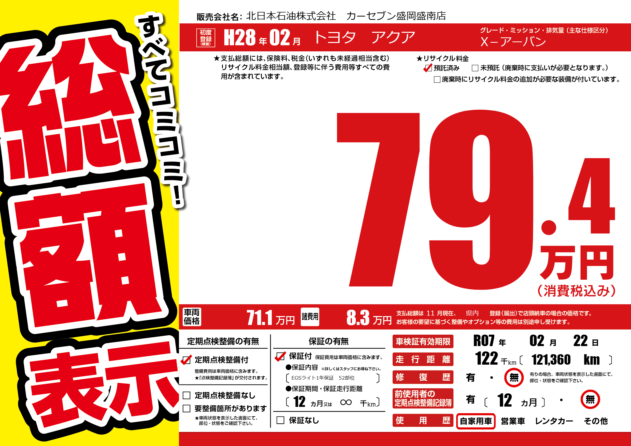 | 車名 | トヨタ アクア | グレード ミッション 排気量 |