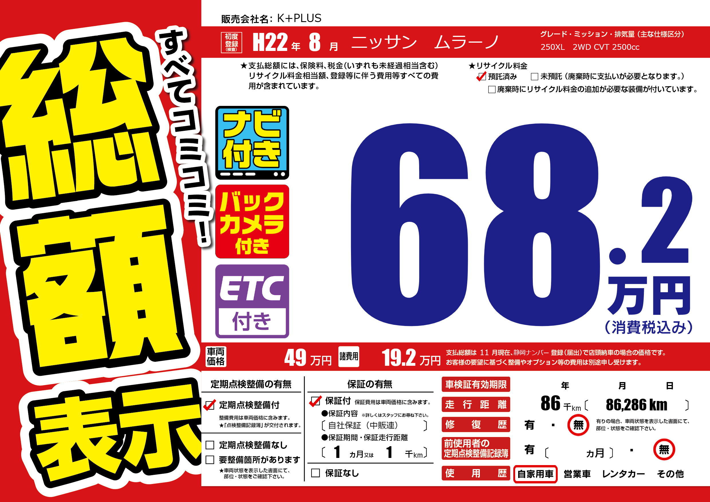 | 走行キロ | 8.6万km | 初年度登録 | H22年8月 |