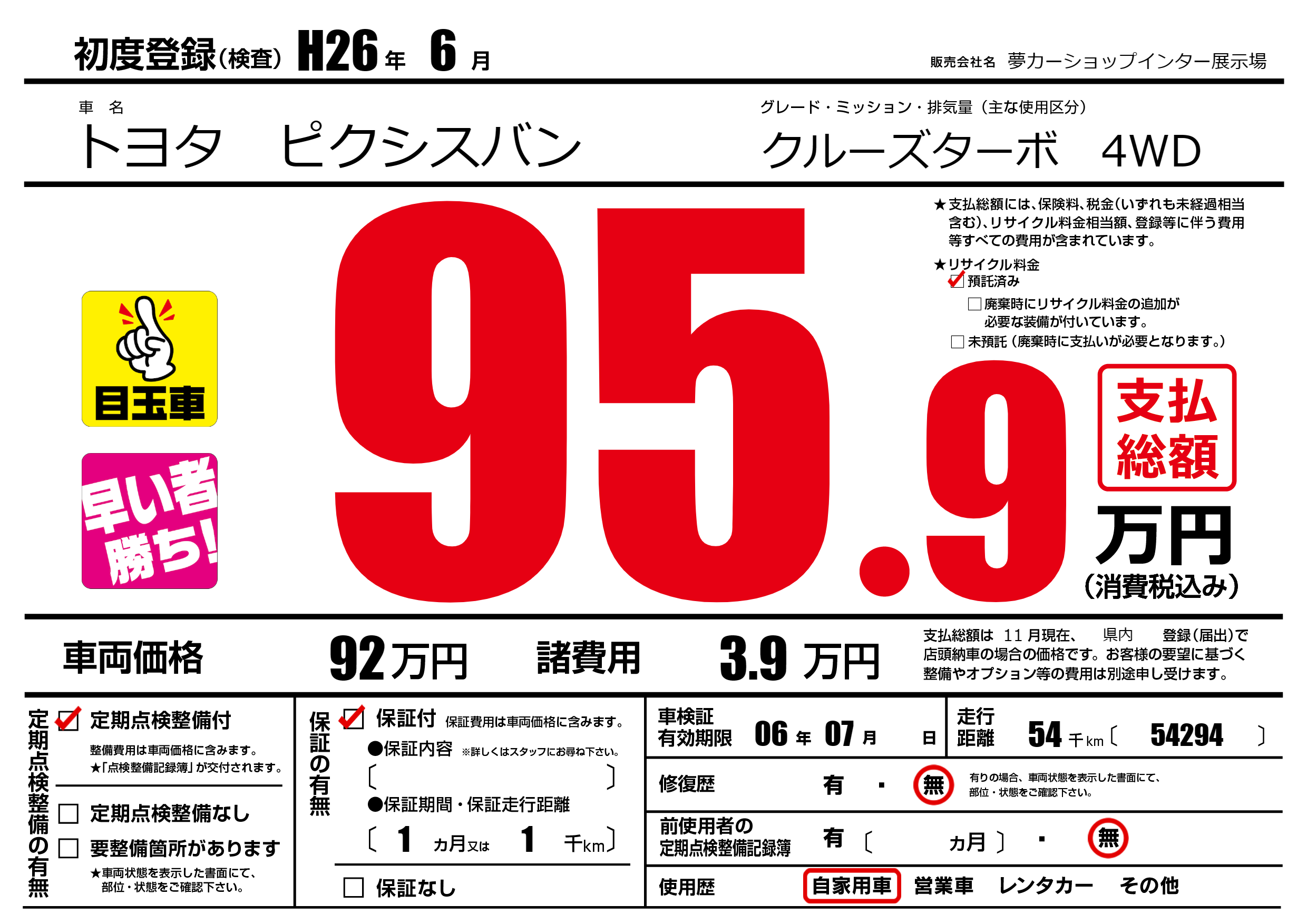 | 走行キロ | 5.4万km | 初年度登録 | H26年6月 |