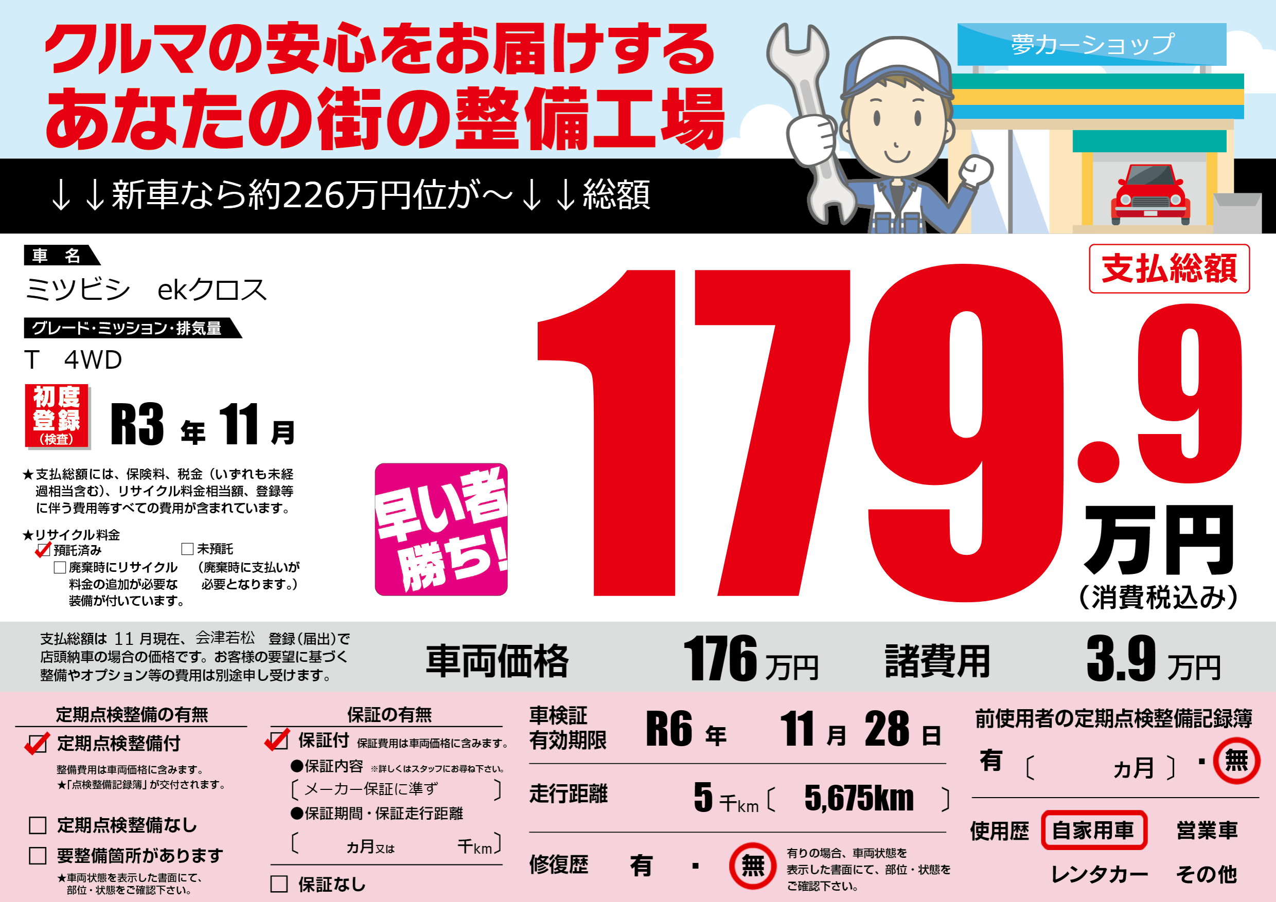 | 車名 | ミツビシ ekクロス | グレード ミッション 排気量 |