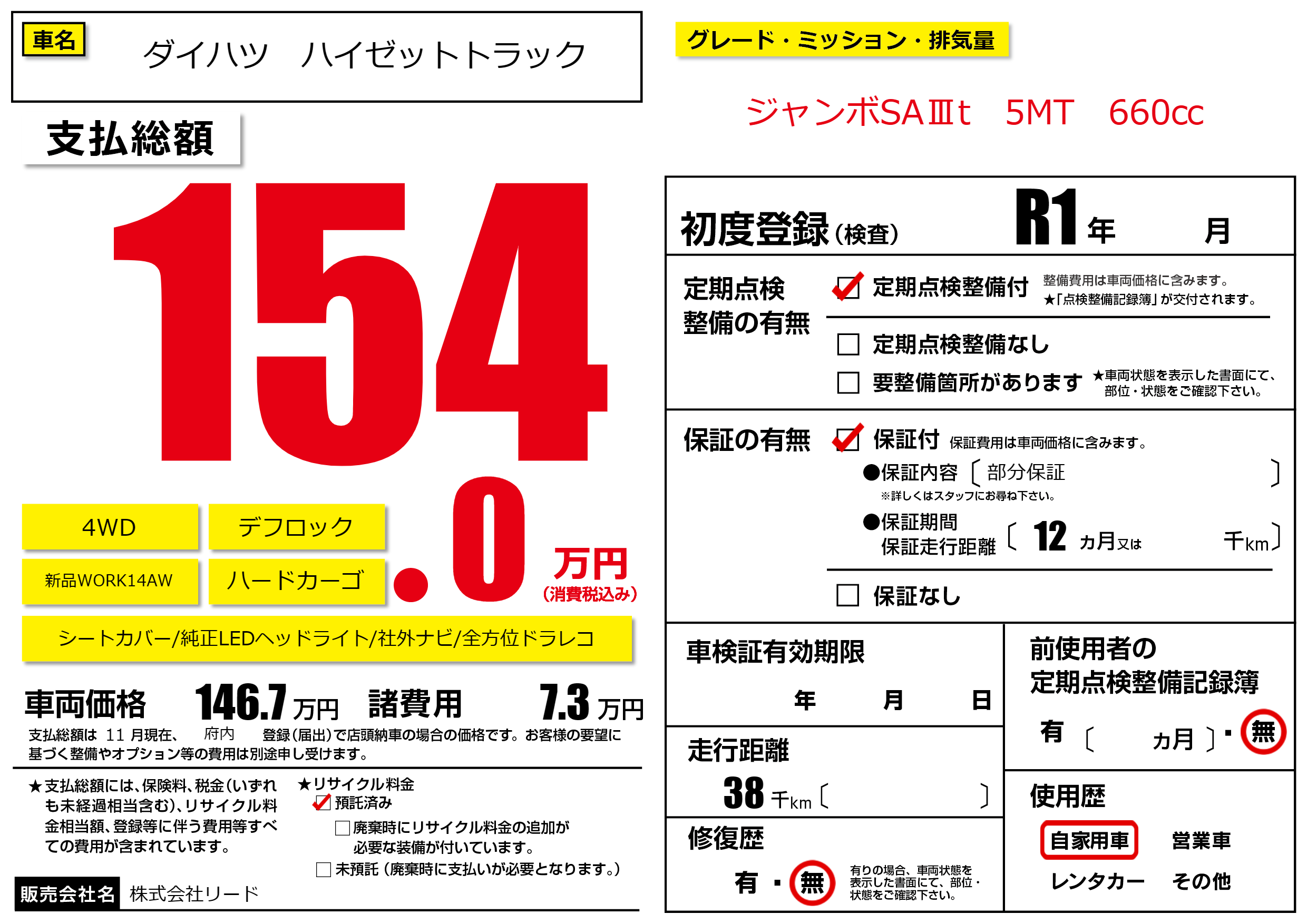 | 走行キロ | 3.8万km | 初年度登録 | R1年---月 |