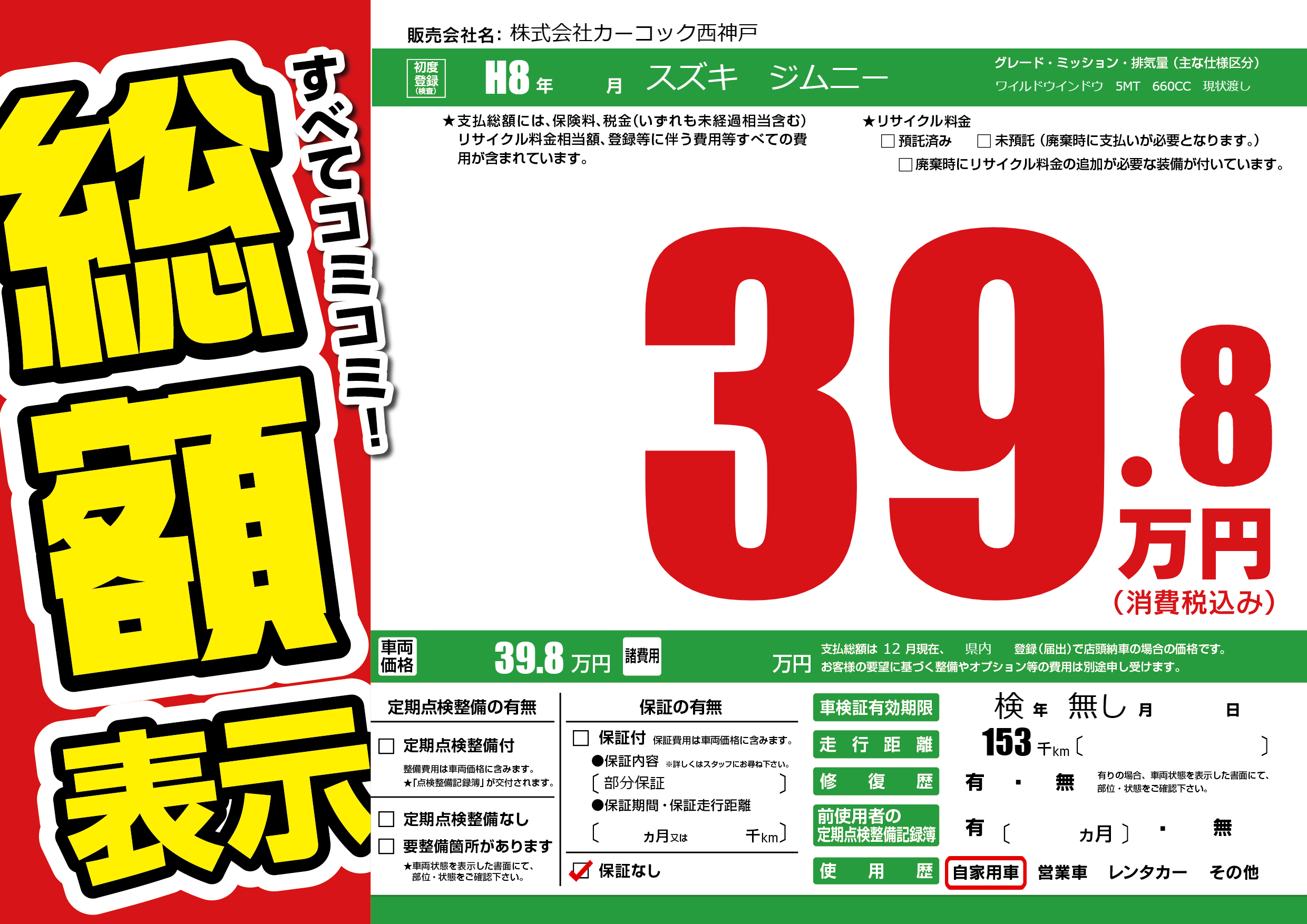 保証なし 保証内容(部分保証) ---ヶ月または()千kmまで |