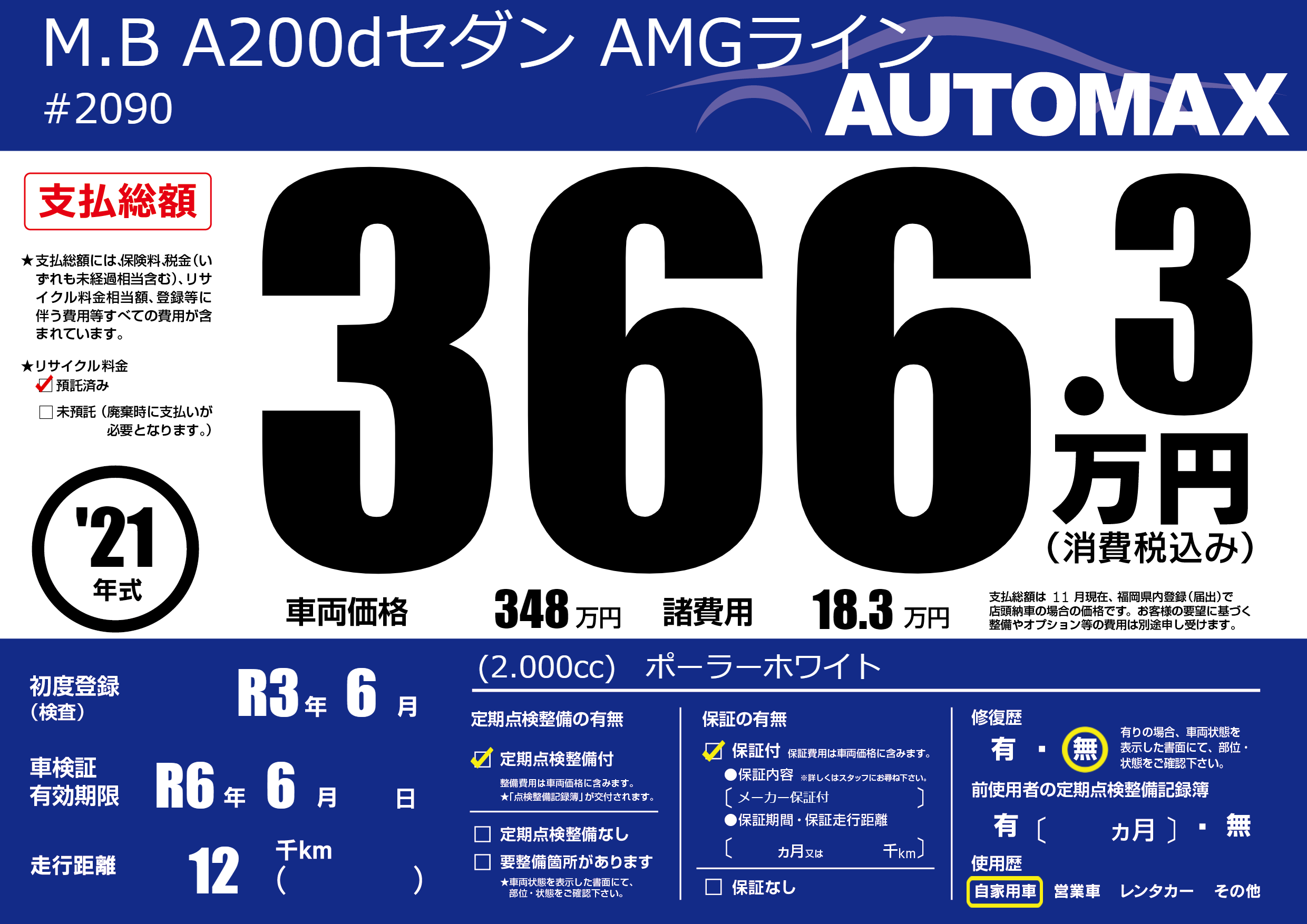 | 車名 | M.B A200dセダン AMGライン | グレード ミッション 排気量 |