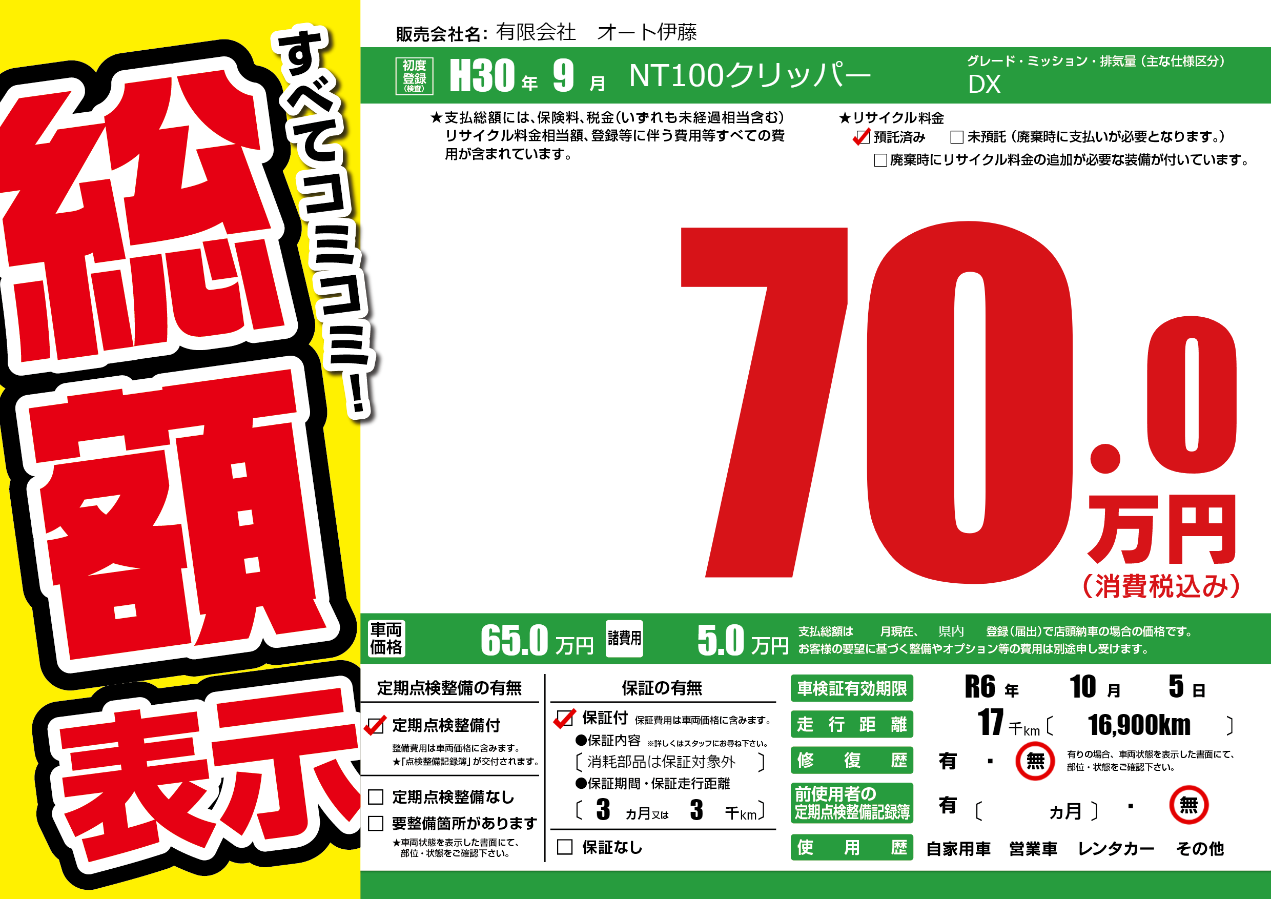 | 車名 | NT100クリッパー | グレード ミッション 排気量 |