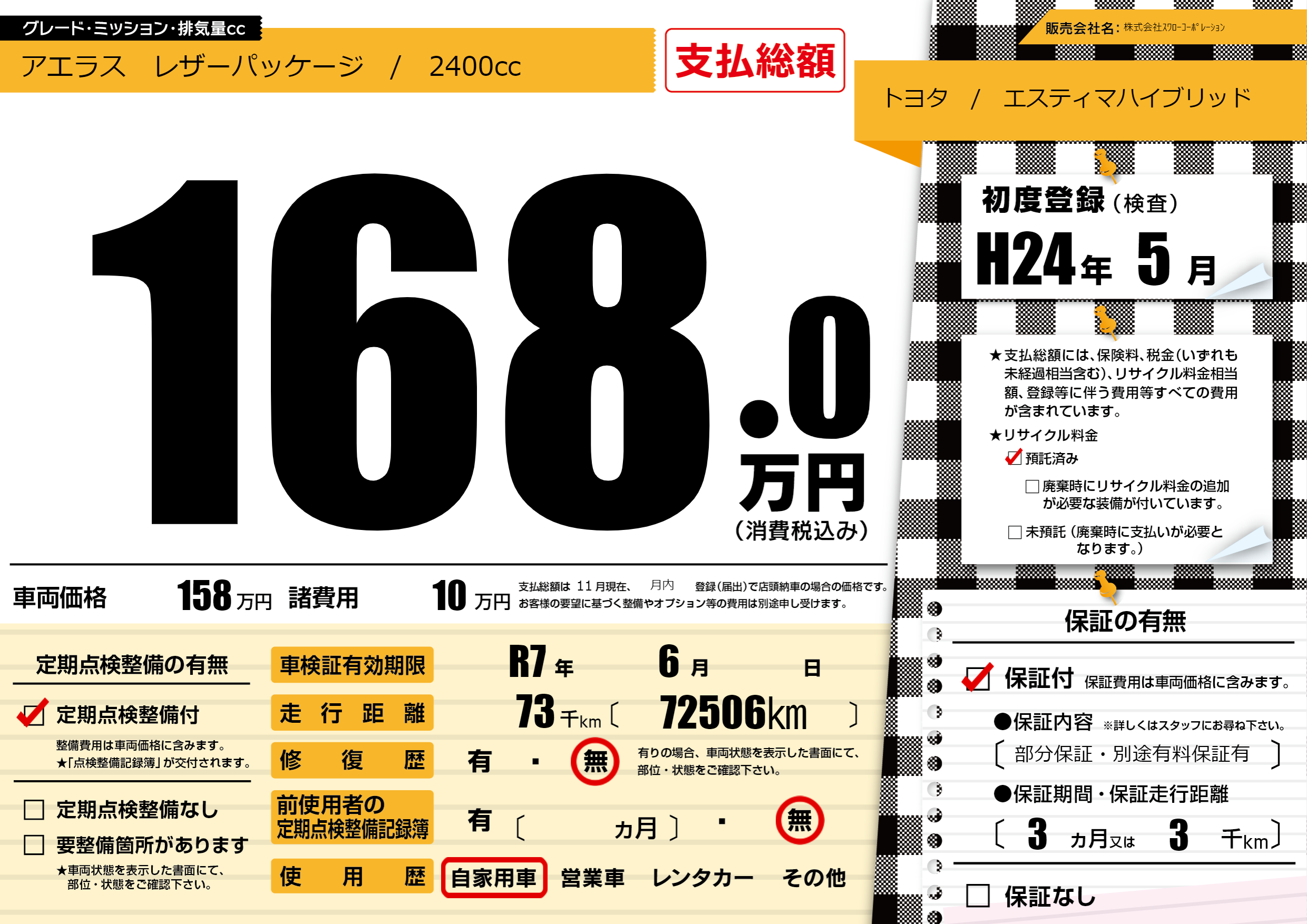 | 車名 | トヨタ / エスティマハイブリッド | グレード ミッション 排気量 |