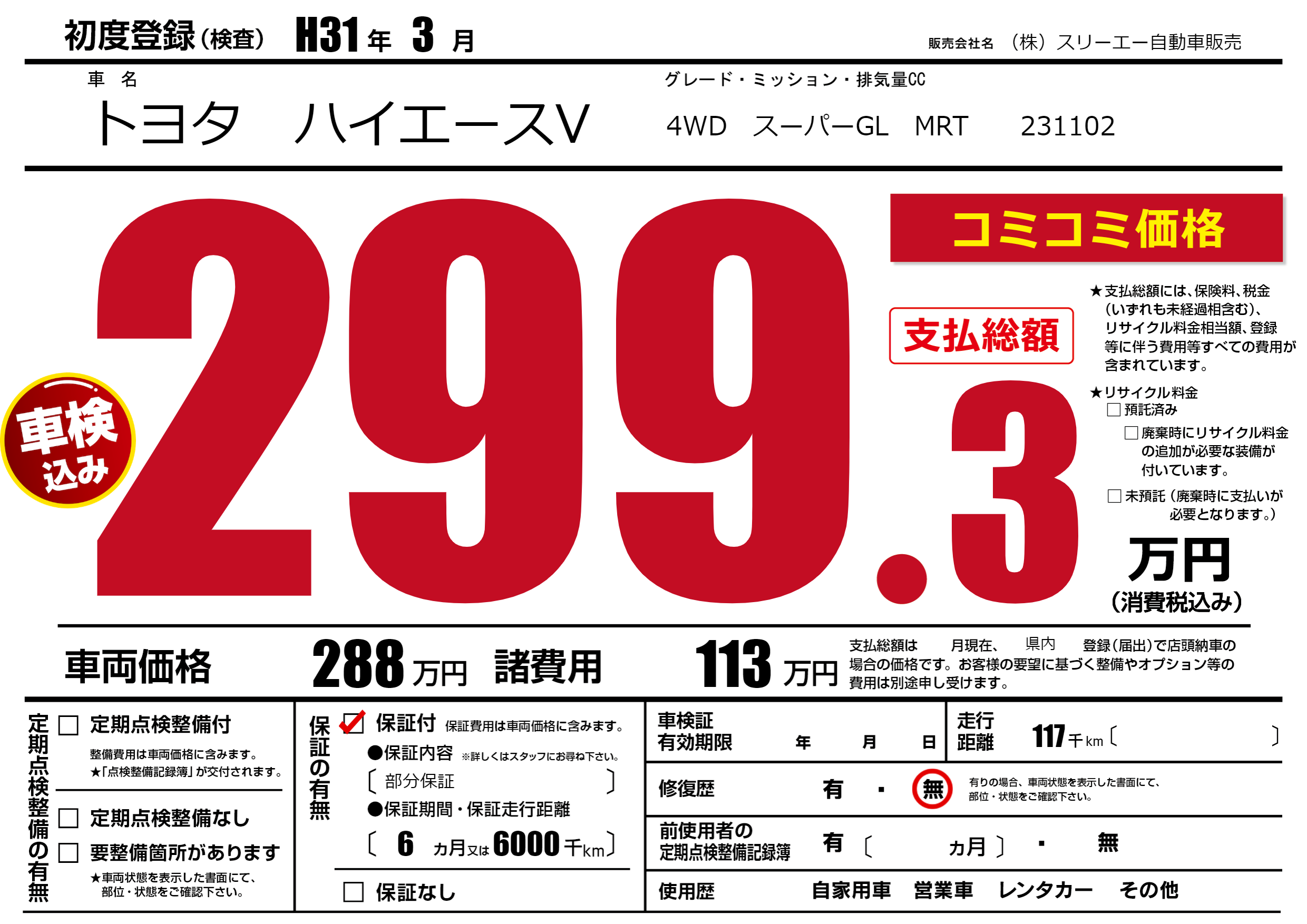 | 車名 | トヨタ ハイエースV | グレード ミッション 排気量 |