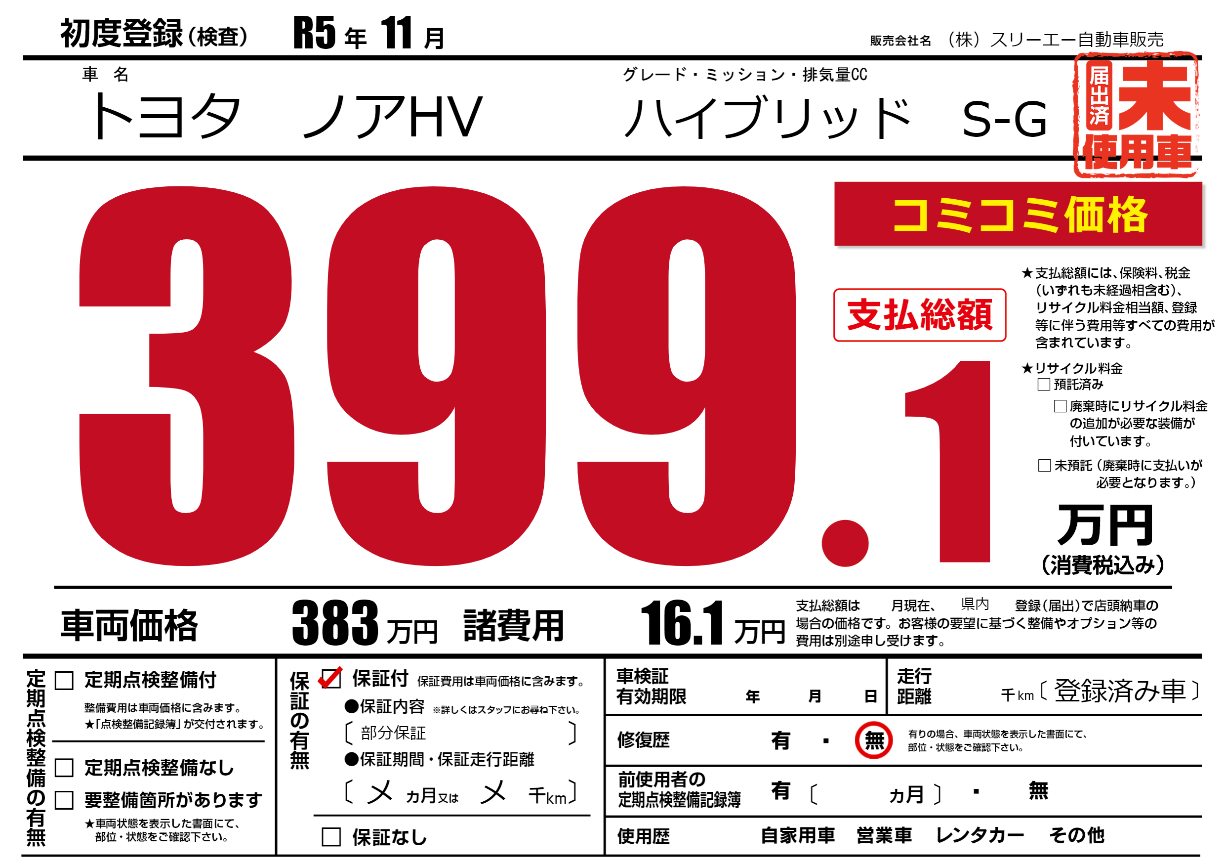 | 車名 | トヨタ ノアHV | グレード ミッション 排気量 |