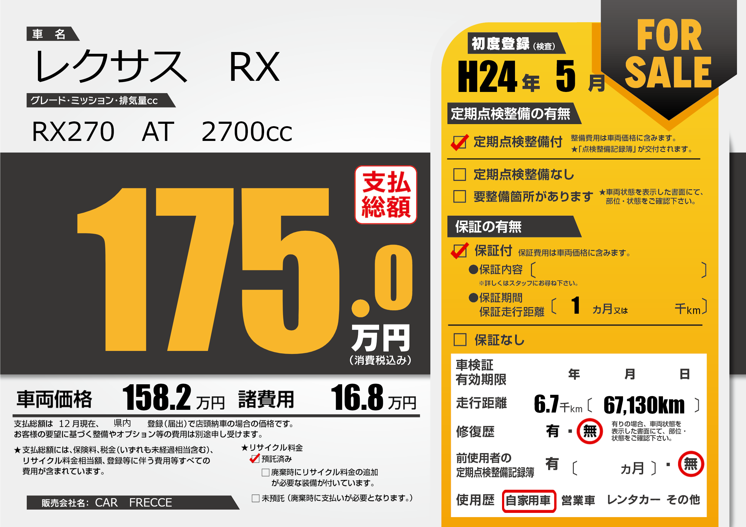 | 車名 | レクサス RX | グレード ミッション 排気量 |