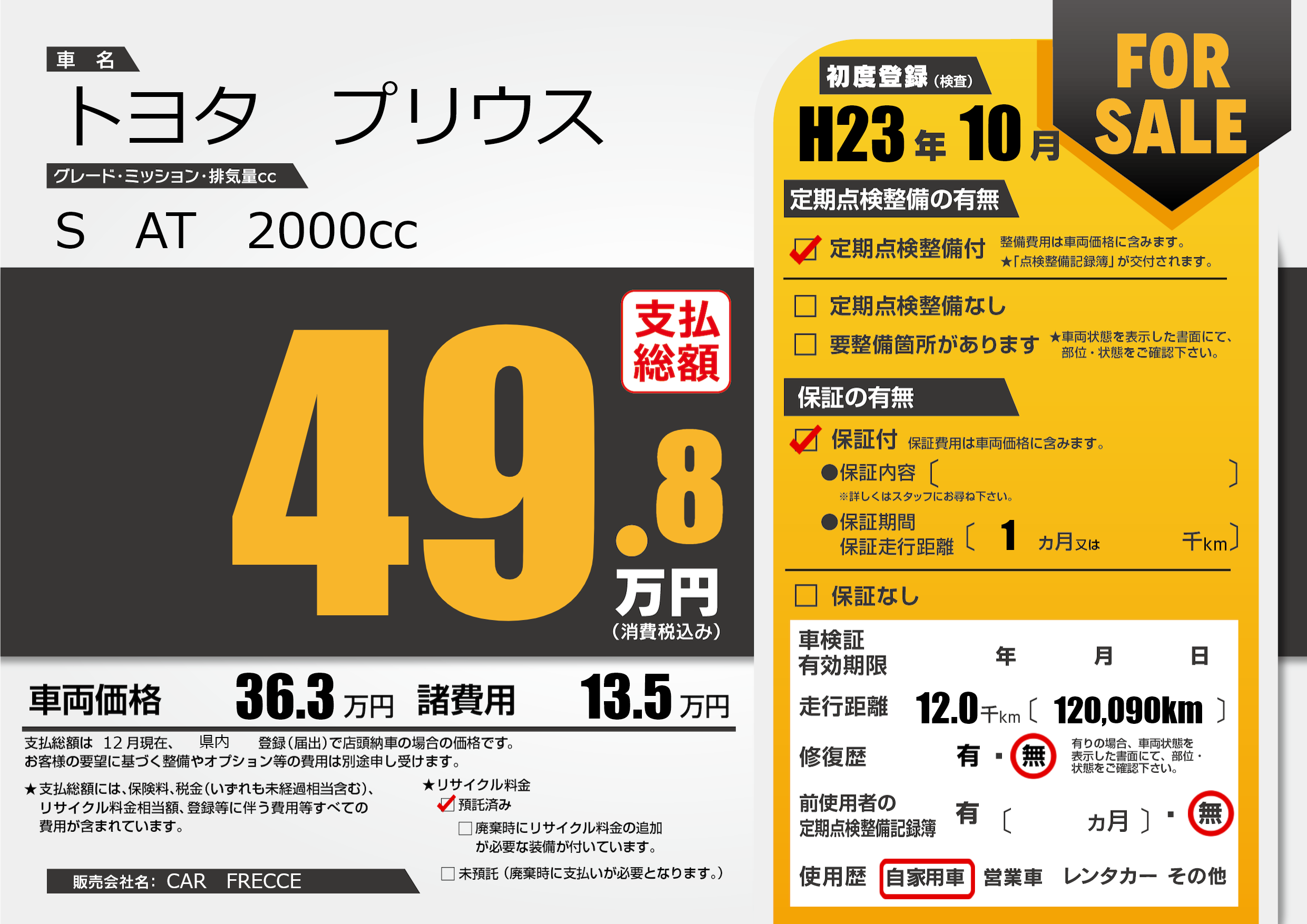 | 車名 | トヨタ プリウス | グレード ミッション 排気量 |