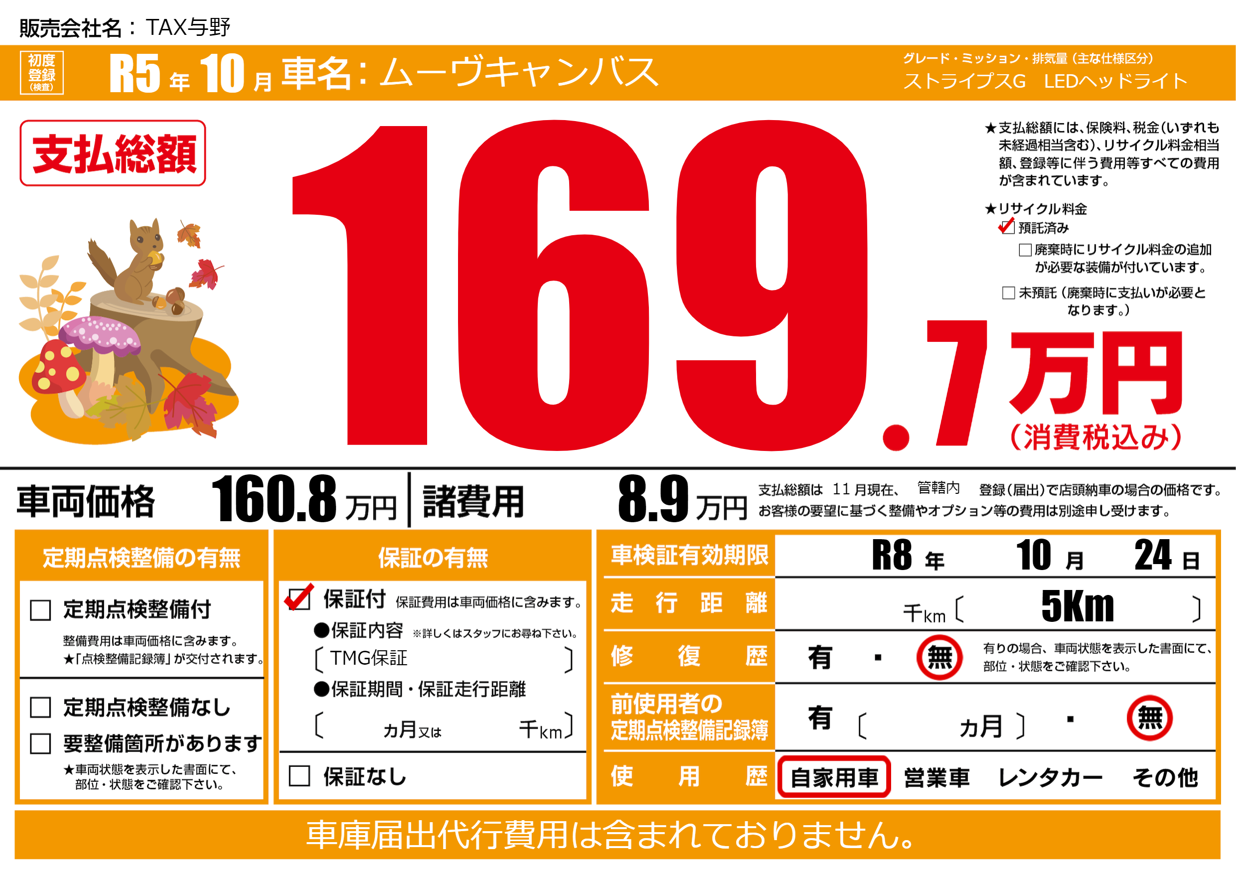 | 走行キロ | - | 初年度登録 | R5年10月 |
