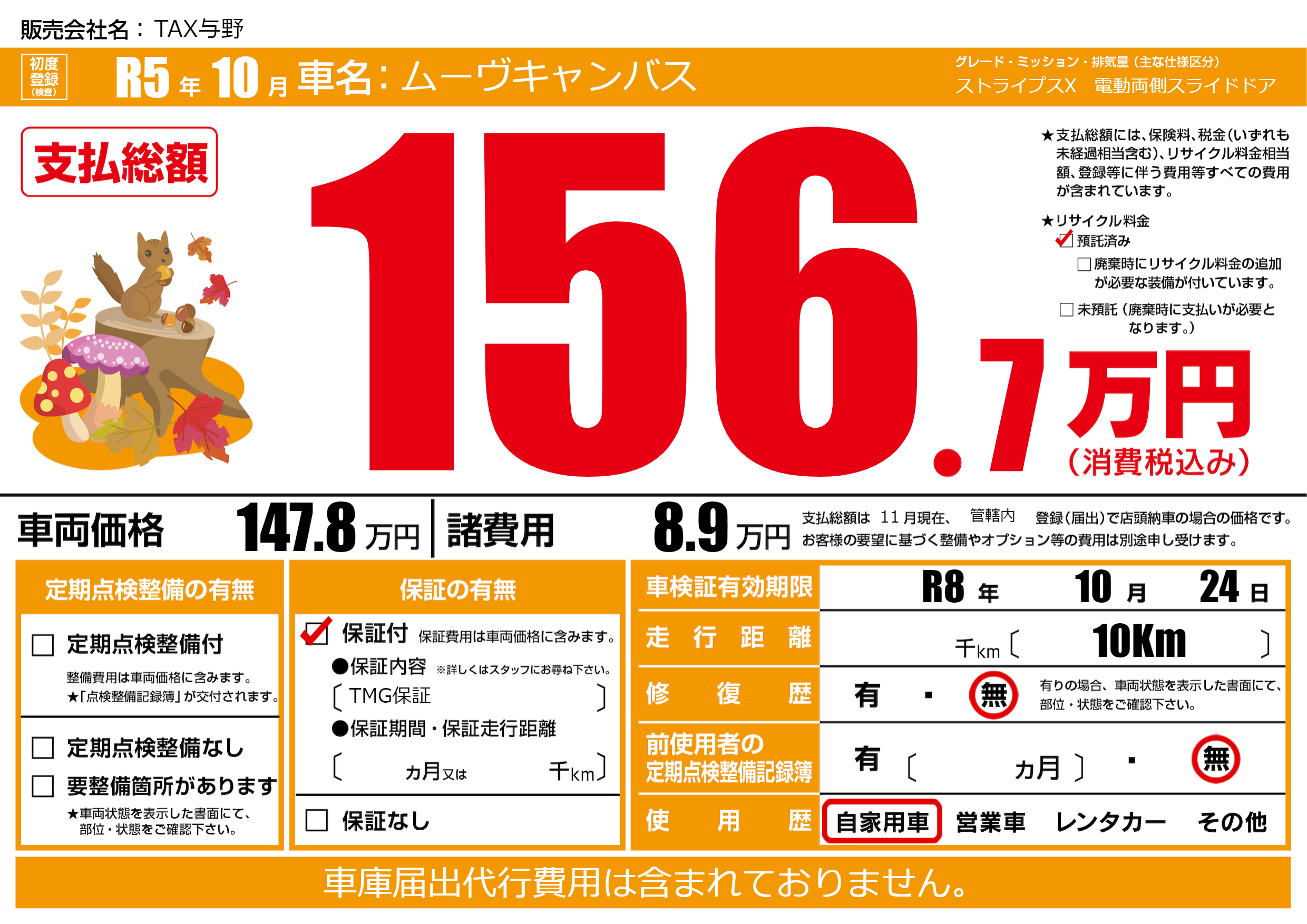 | 走行キロ | - | 初年度登録 | R5年10月 |