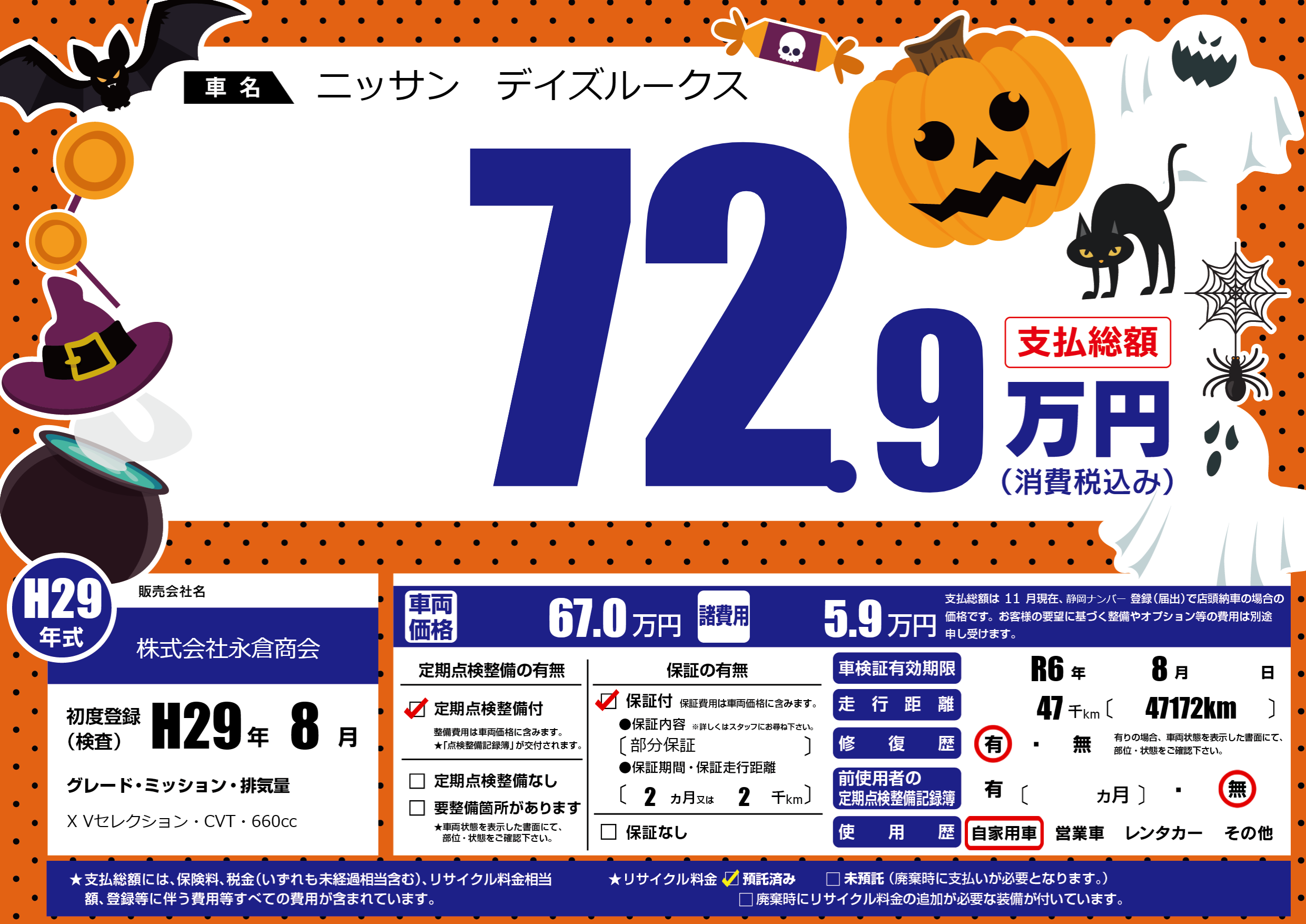 | 走行キロ | 4.7万km | 初年度登録 | H29年8月 |