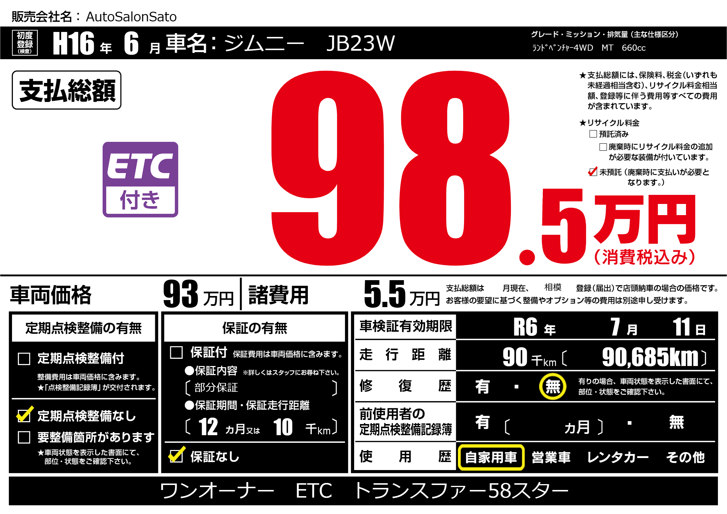 | 車名 | ジムニー JB23W | グレード ミッション 排気量 |