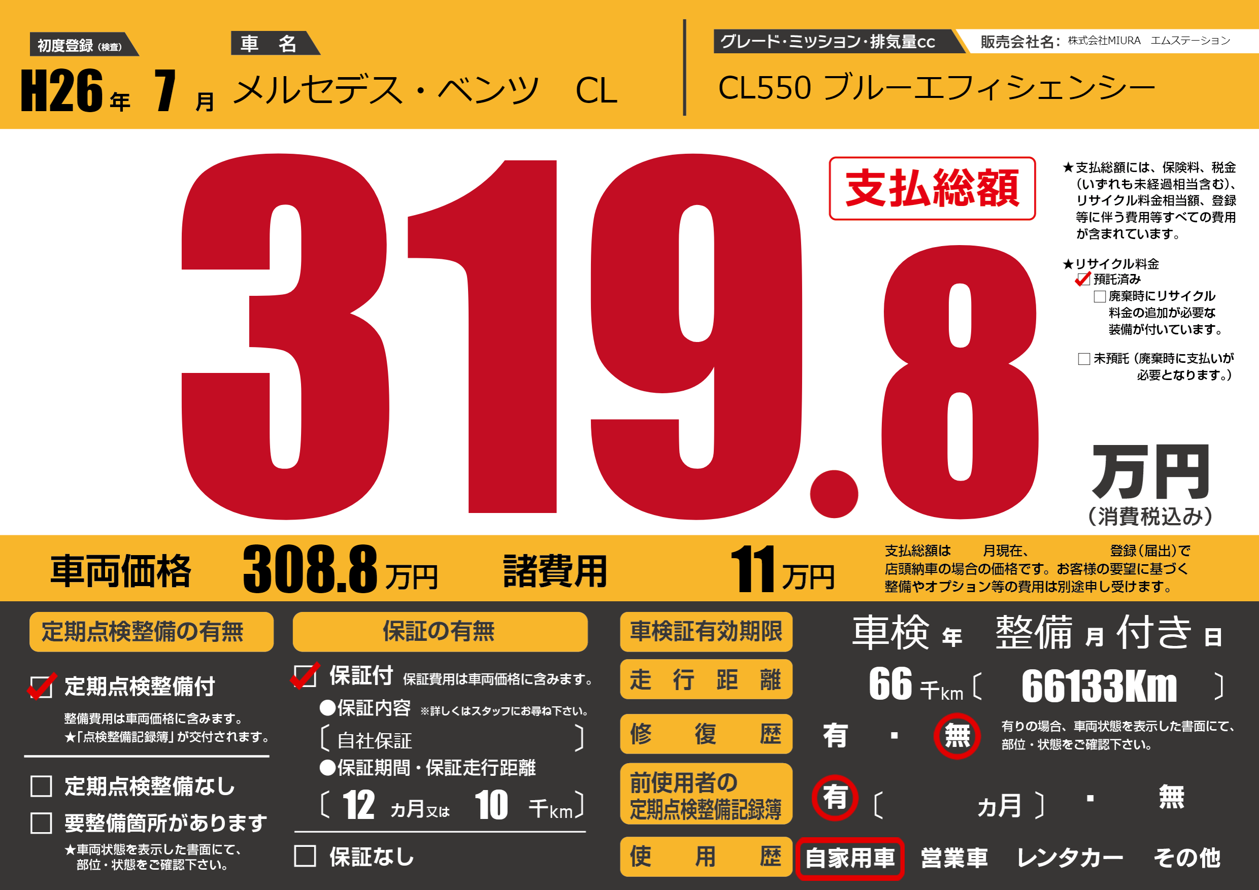 | 車名 | メルセデス・ベンツ CL | グレード ミッション 排気量 |