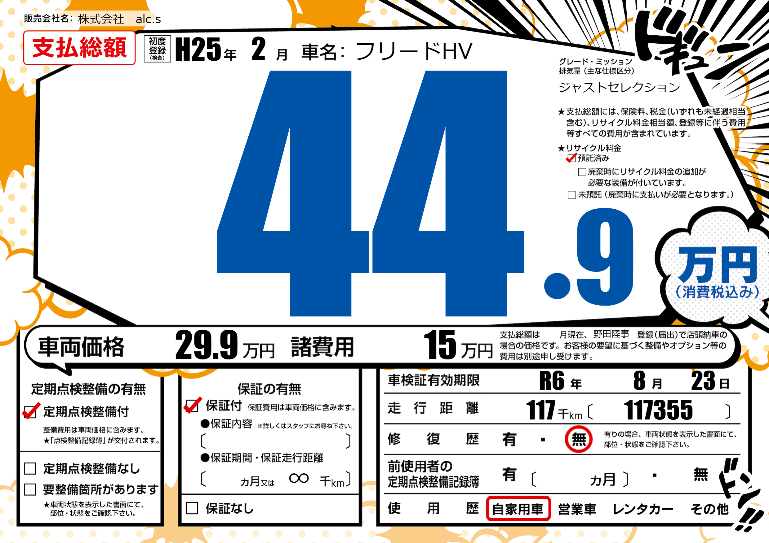 | 走行キロ | 11.7万km | 初年度登録 | H25年2月 |