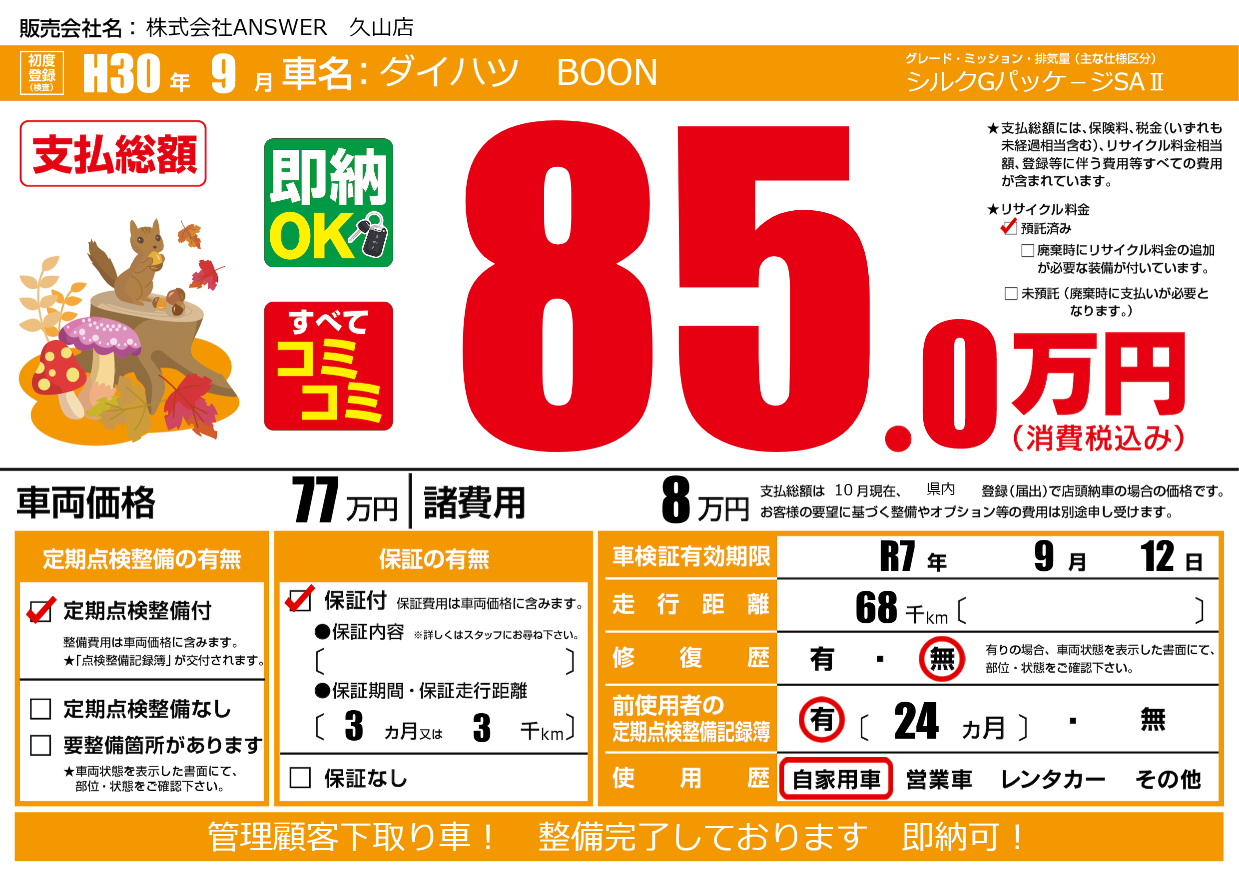 | 走行キロ | 6.8万km | 初年度登録 | H30年9月 |