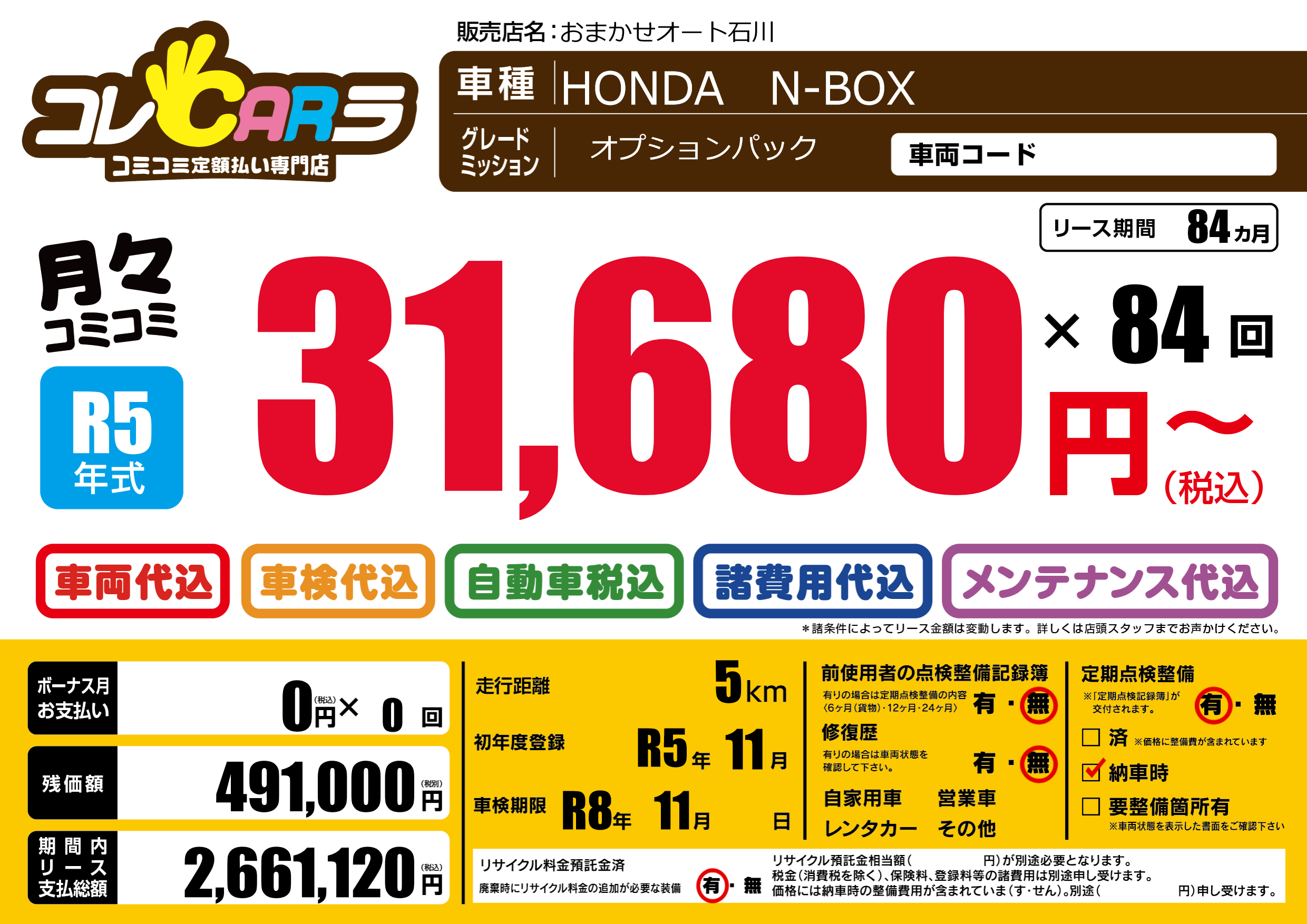 | 走行キロ | 0.5万km | 初年度登録 | R5年11月 |