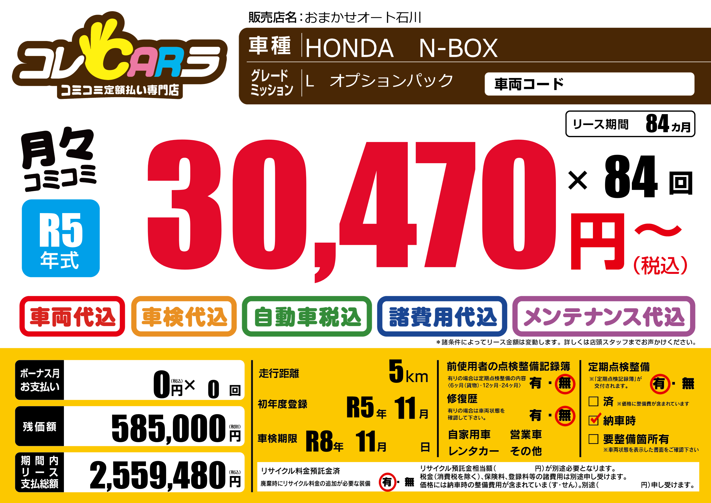| 走行キロ | 0.5万km | 初年度登録 | R5年11月 |