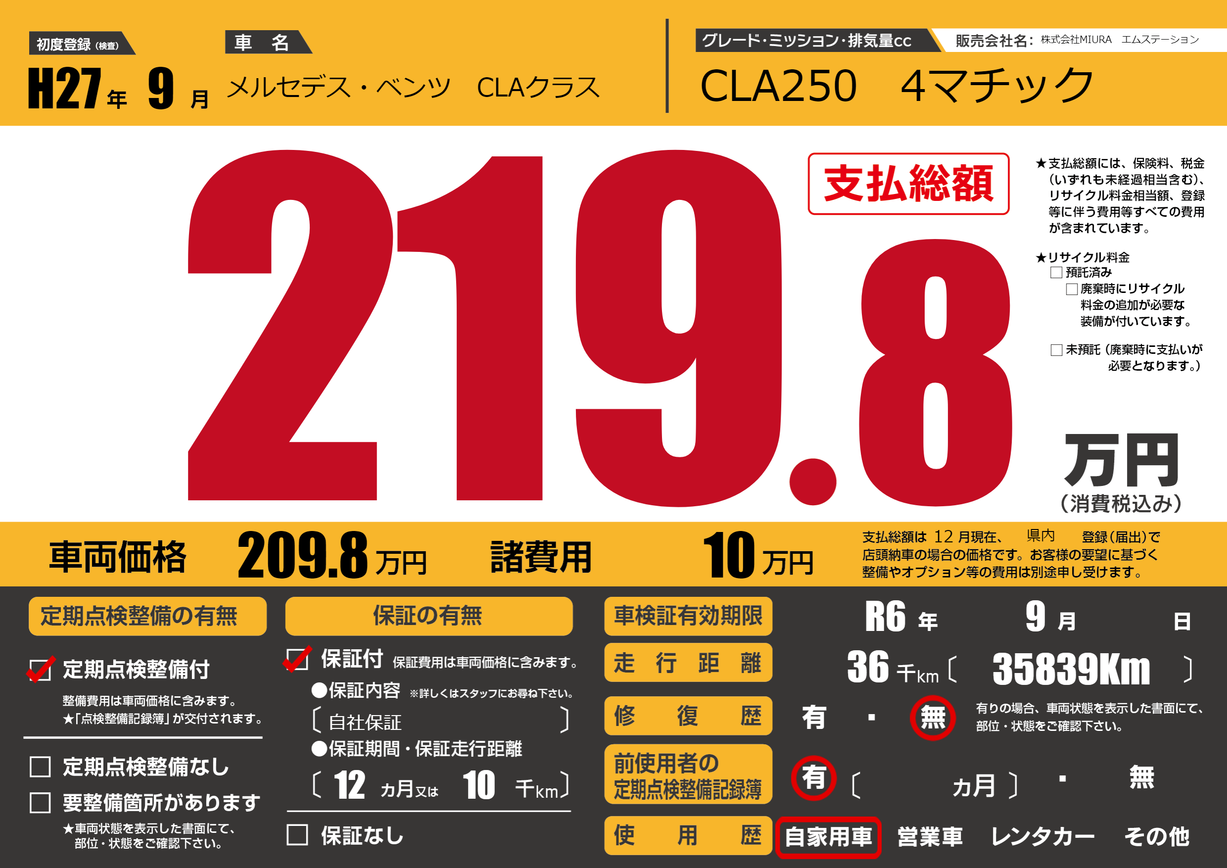 | 車名 | メルセデス・ベンツ CLAクラス | グレード ミッション 排気量 |