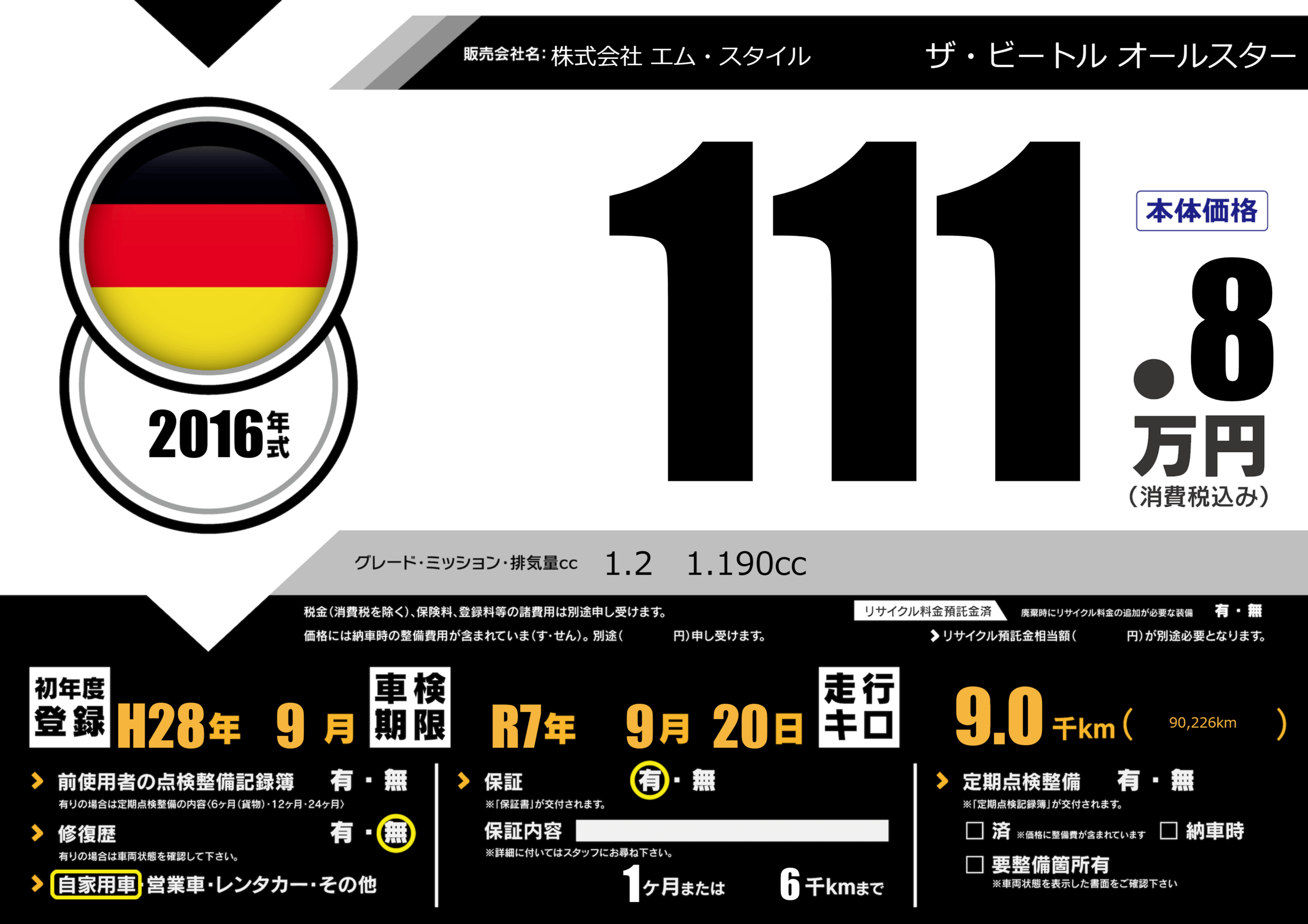 | 車名 | ザ・ビートル オールスター | グレード ミッション 排気量 |