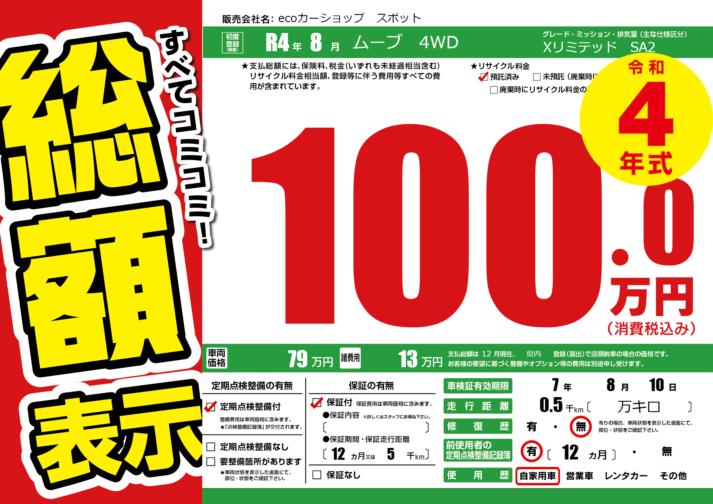 | 車名 | ムーブ 4WD | グレード ミッション 排気量 |