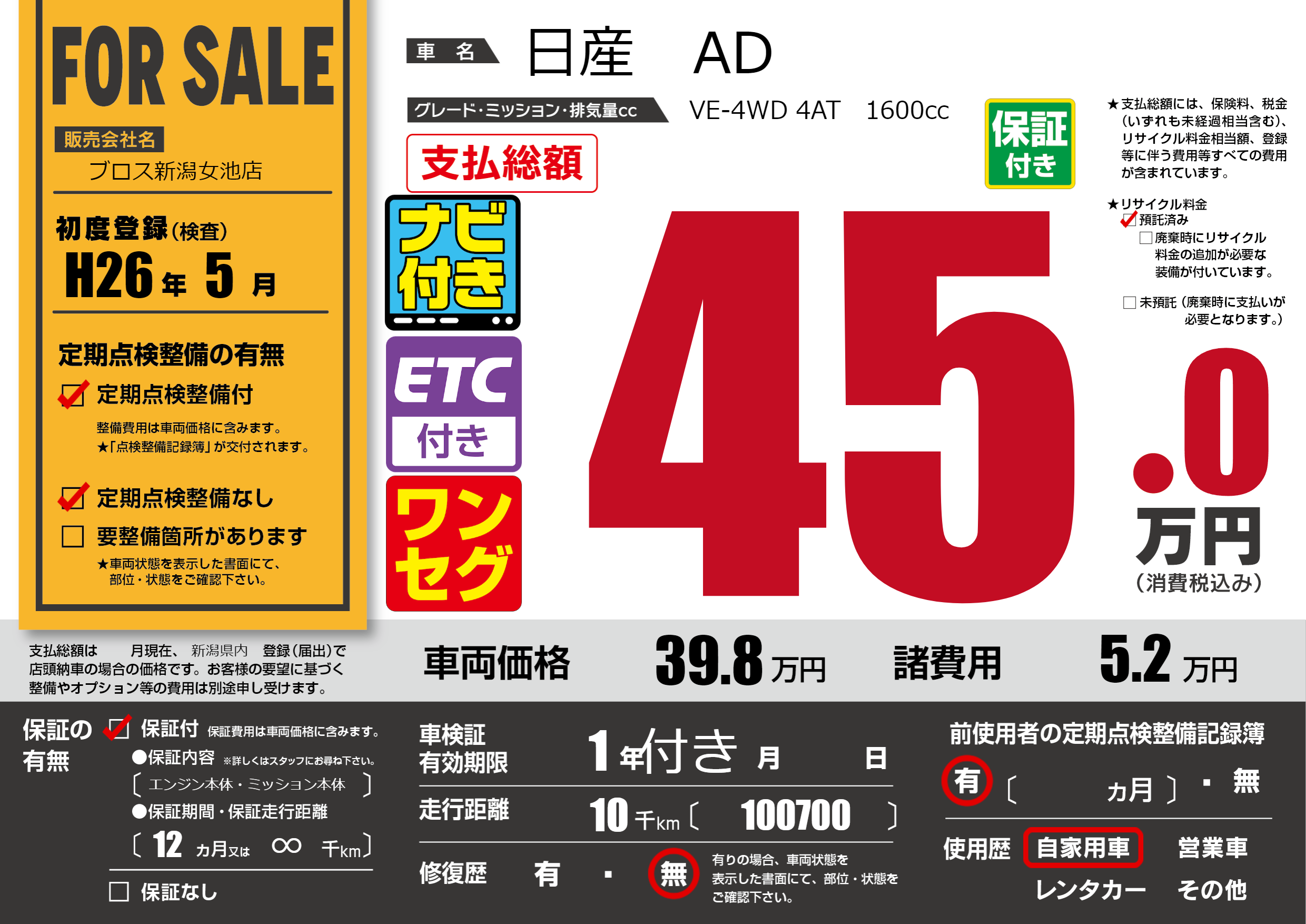 | 車名 | 日産 AD | グレード ミッション 排気量 |