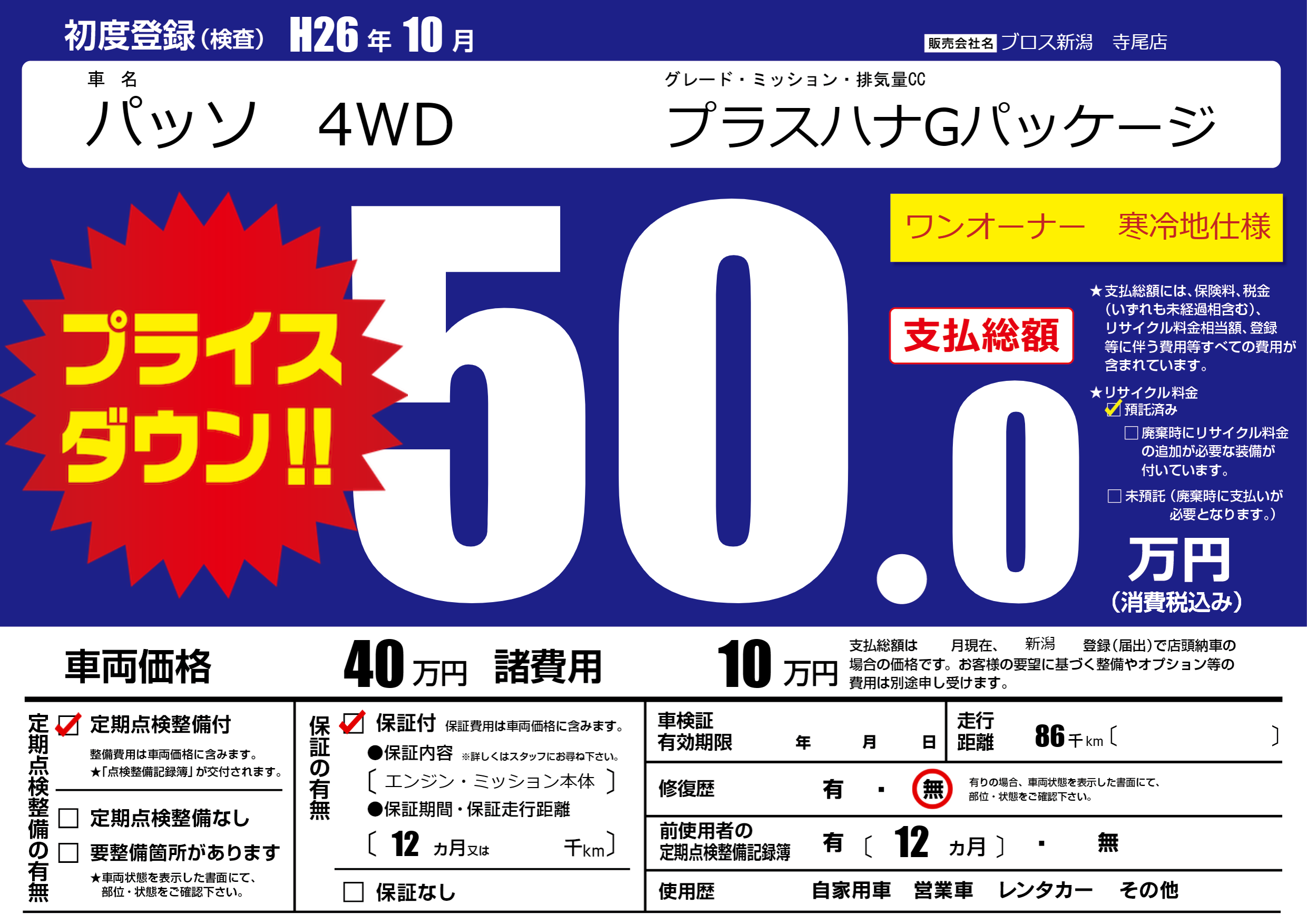 | 車名 | パッソ 4WD | グレード ミッション 排気量 |