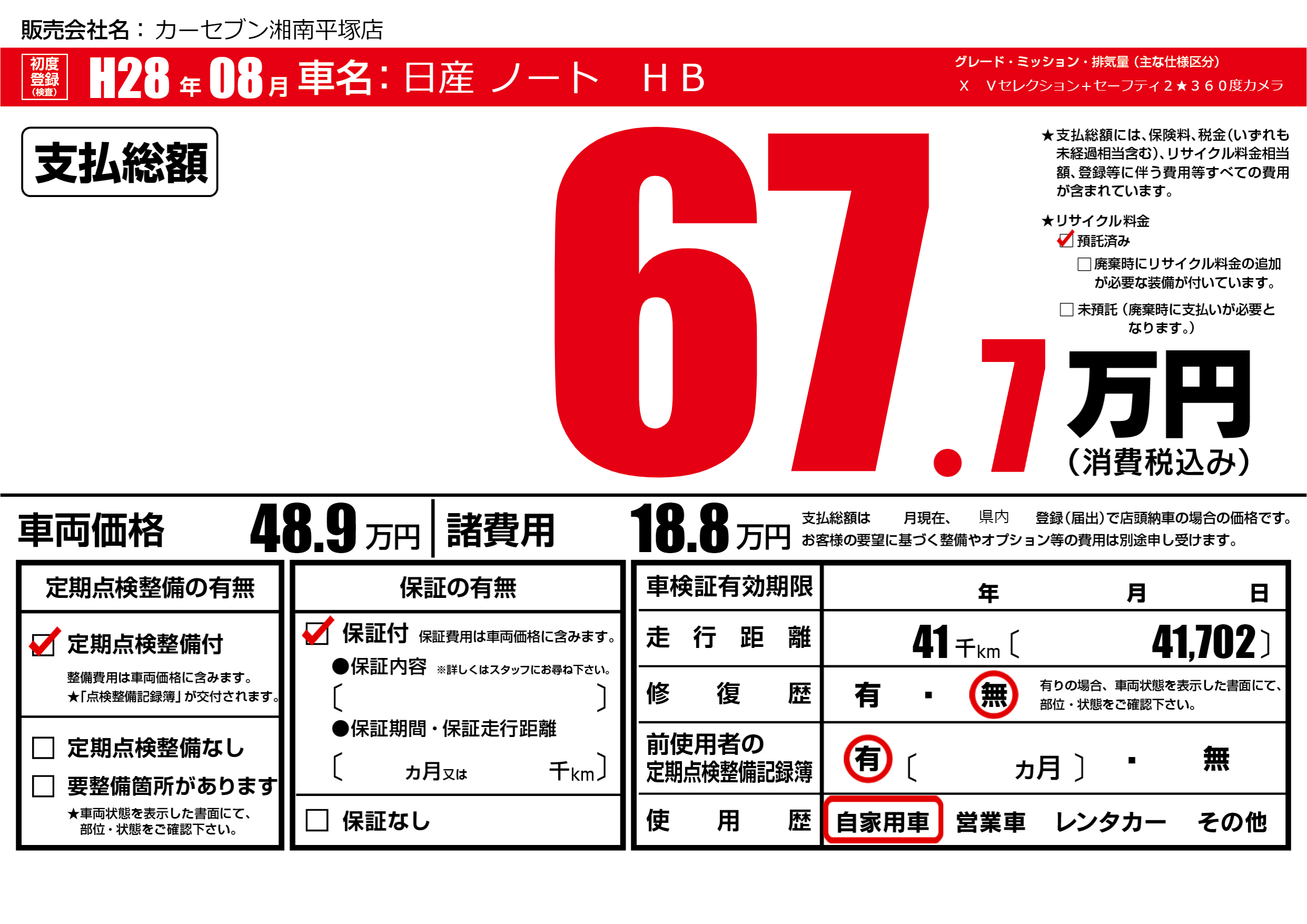 | 車名 | 日産 ノート HB | グレード ミッション 排気量 |
