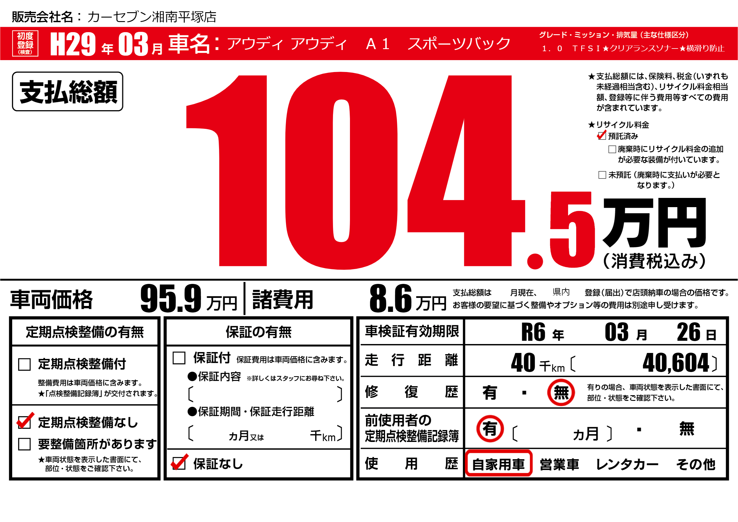 | 車名 | アウディ アウディ A1 スポーツバック | グレード ミッション 排気量 |