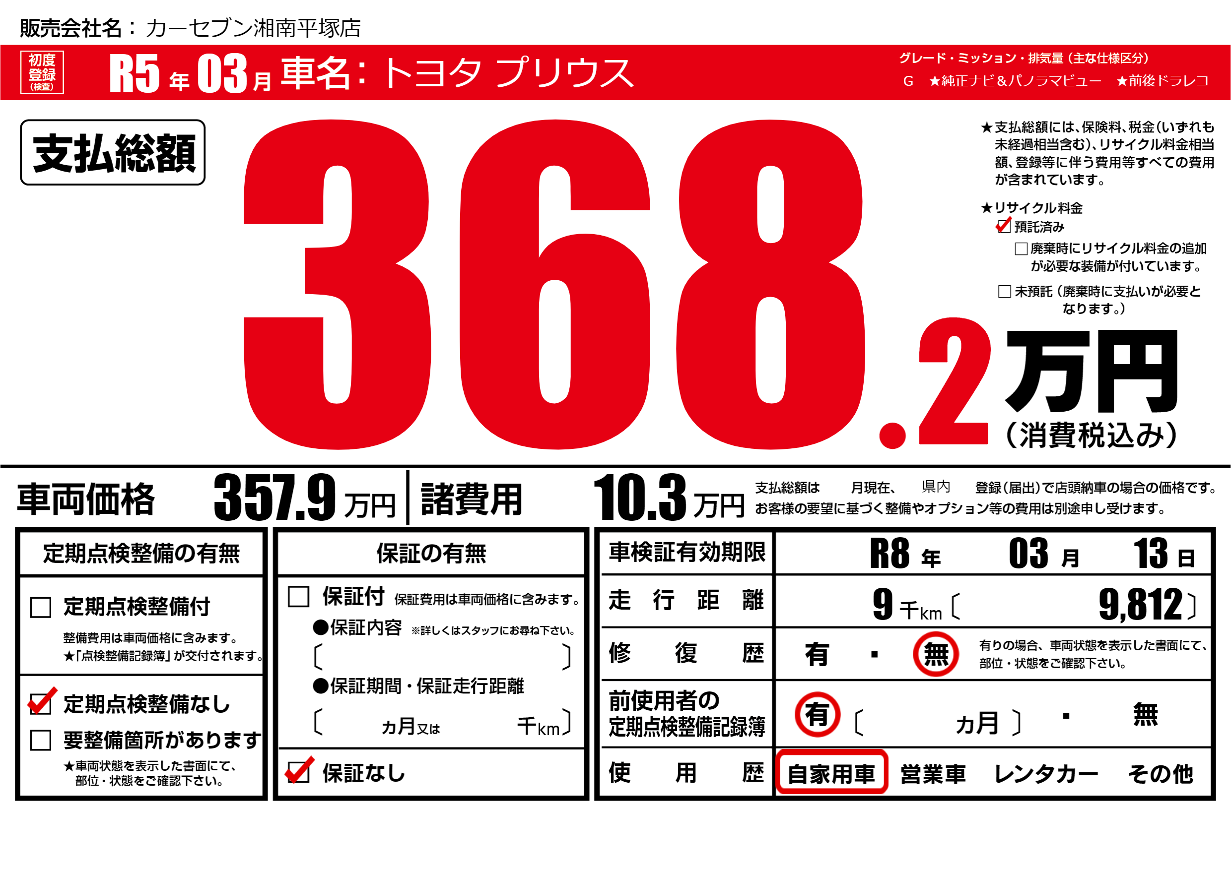 | 車名 | トヨタ プリウス | グレード ミッション 排気量 |
