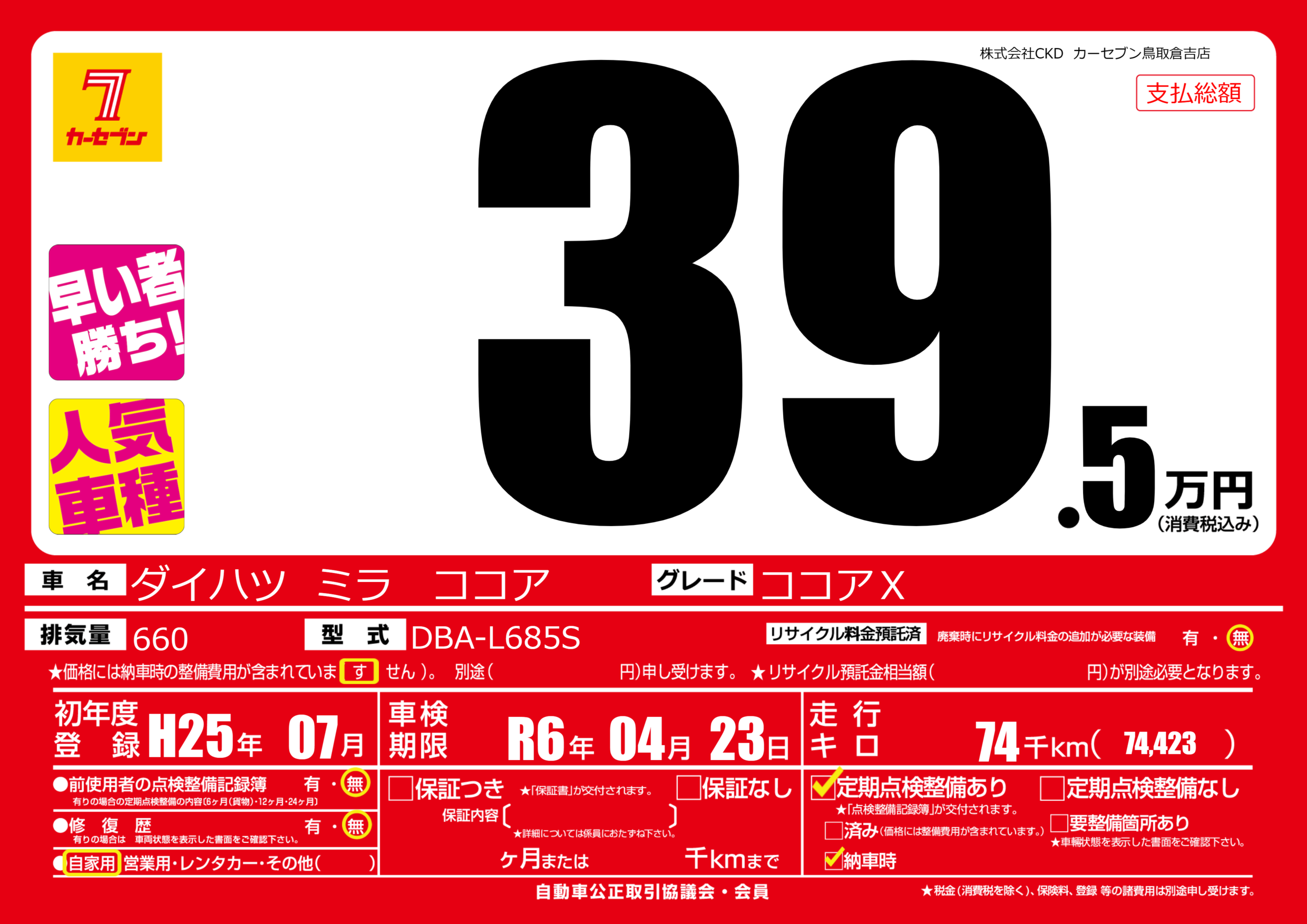| 走行キロ | 7.4万km | 初年度登録 | H25年07月 |
