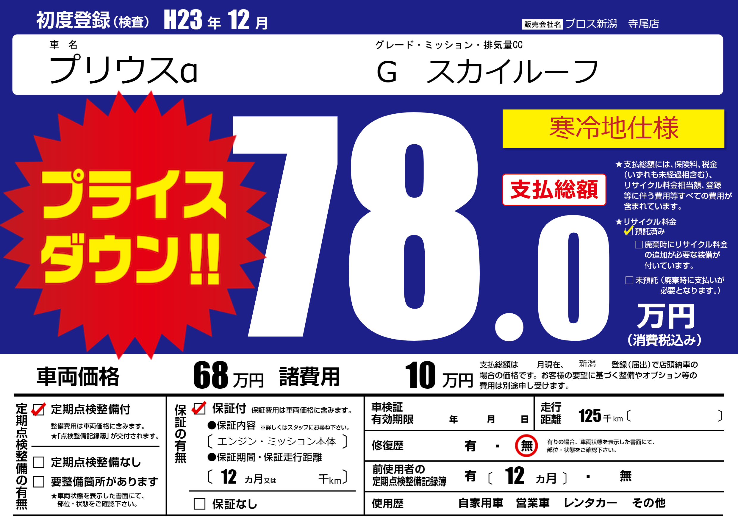 | 走行キロ | 12.5万km | 初年度登録 | H23年12月 |