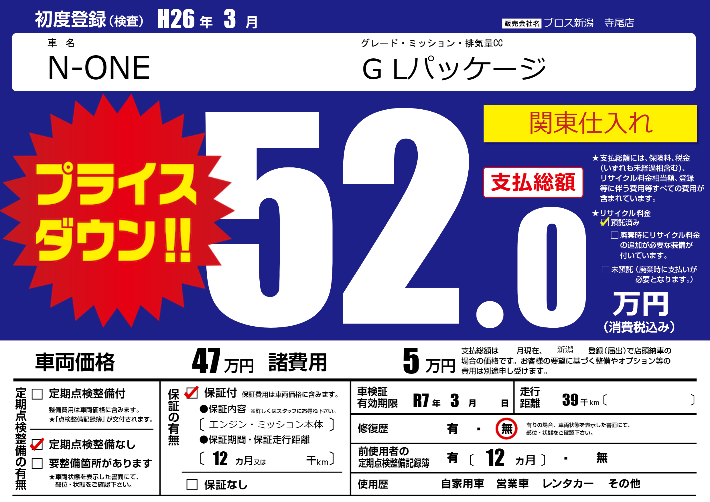 | 走行キロ | 3.9万km | 初年度登録 | H26年3月 |