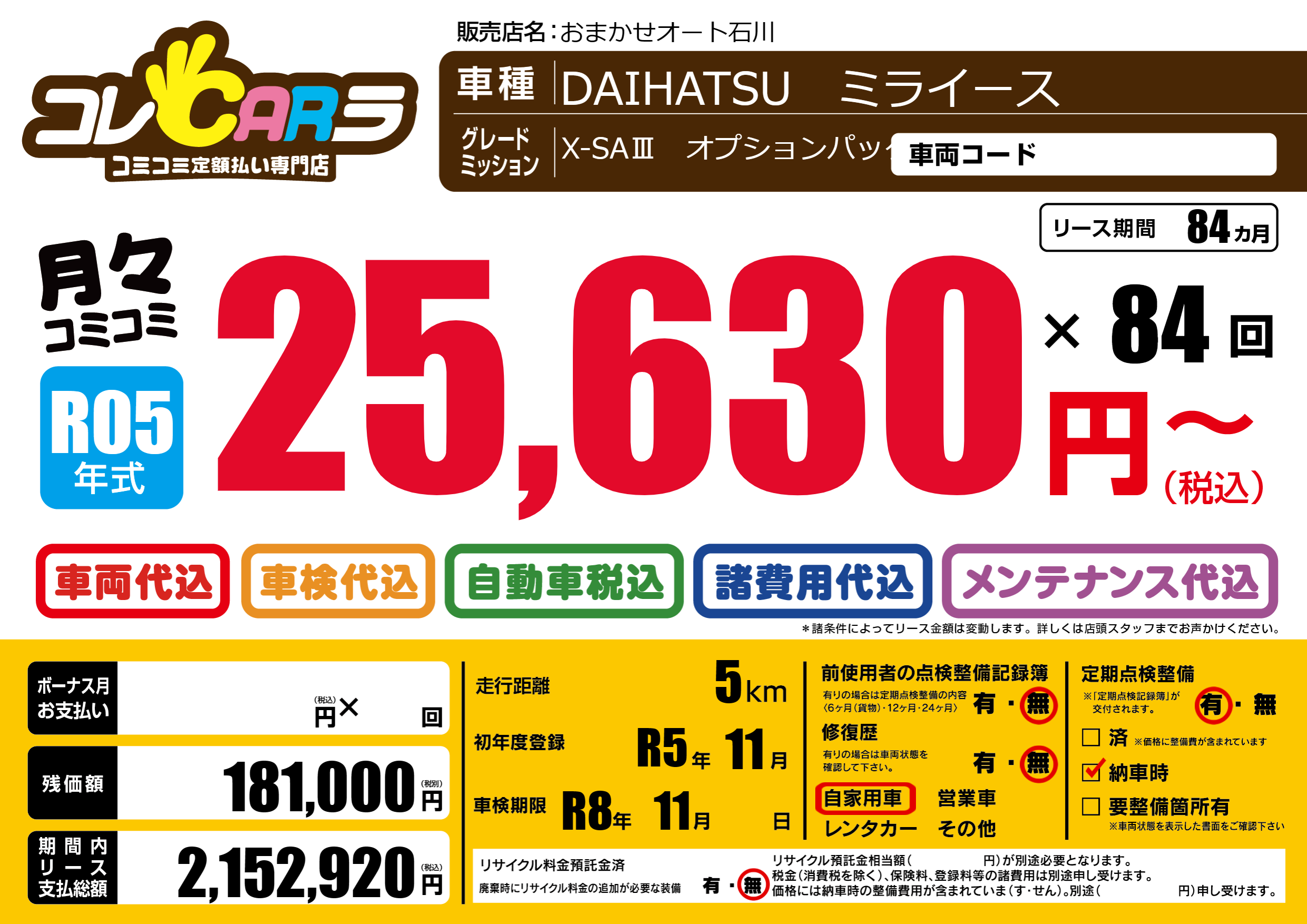 | 車検制限 | R8年 11月 - 日 | ||