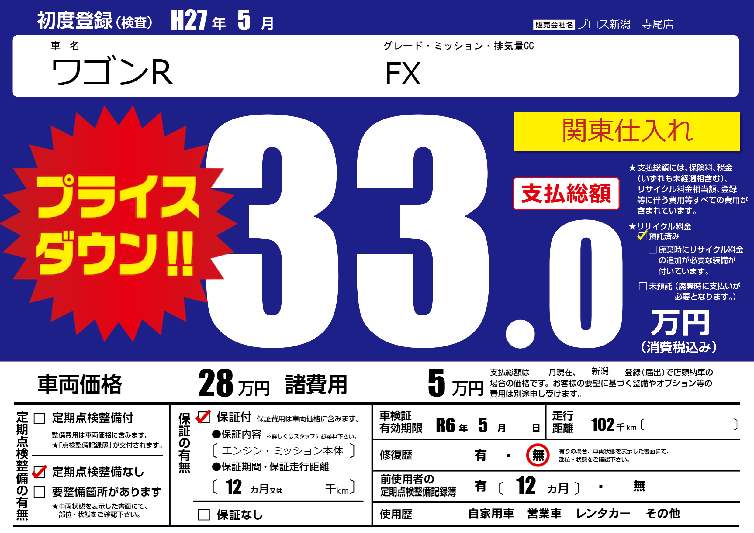 | 走行キロ | 10.2万km | 初年度登録 | H27年5月 |